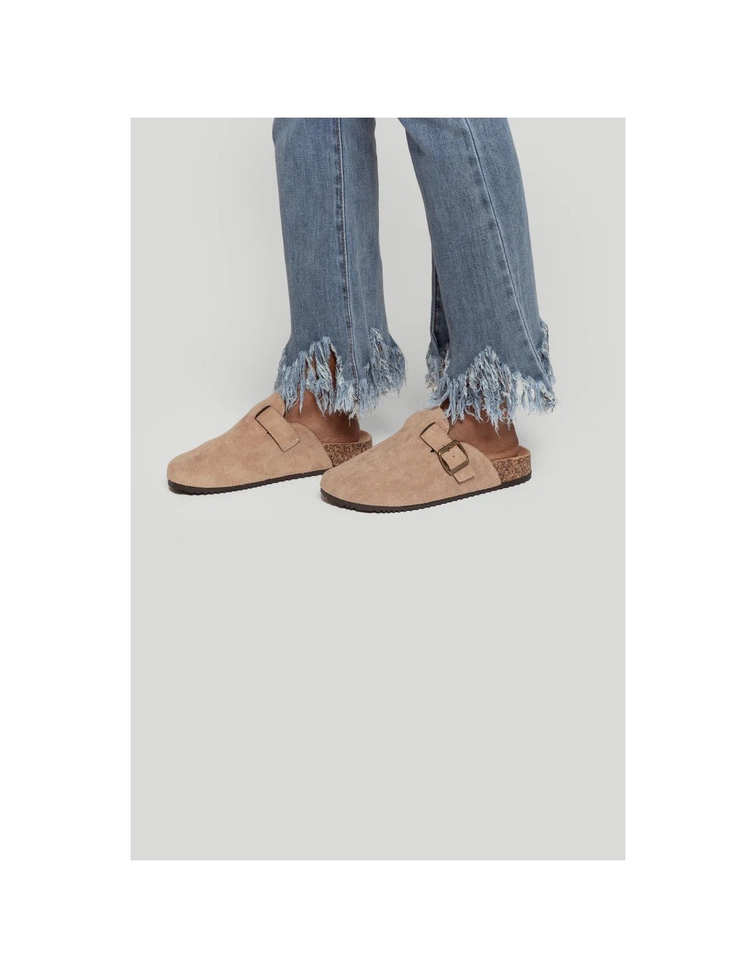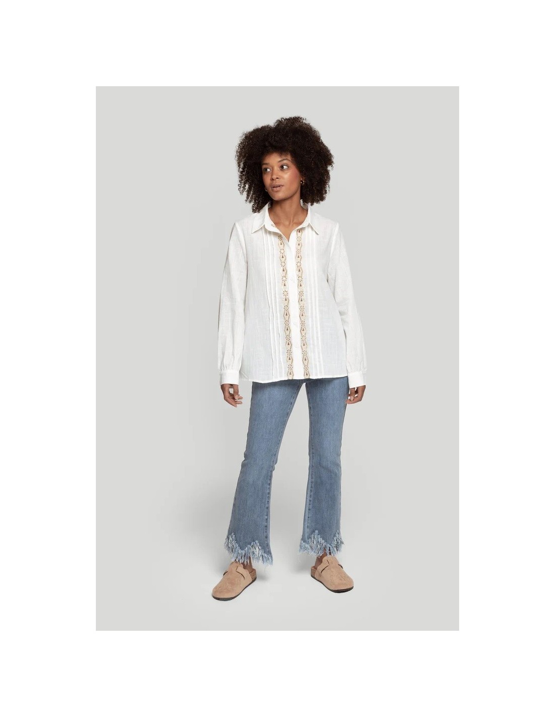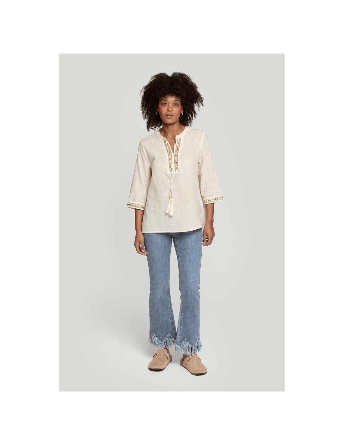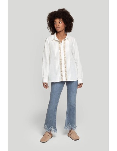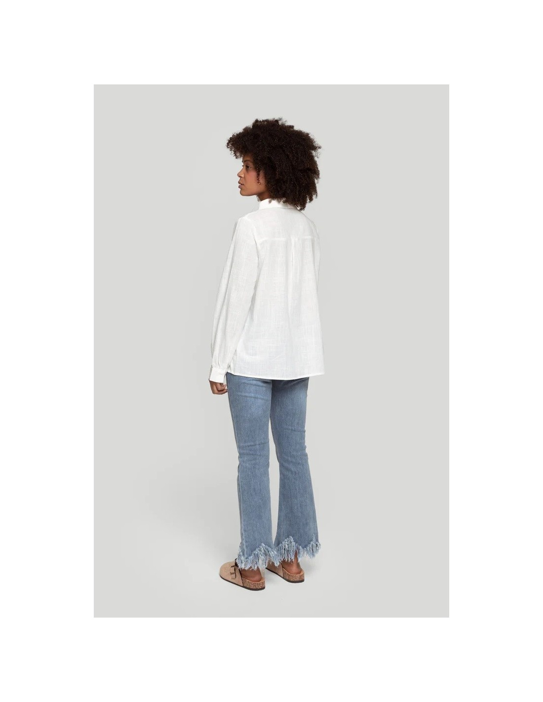 • Diseño recto. Tiro alto. Cinco bolsillos. Cierre de cremallera y botón. Trabillas. Bajo flecos. Bajo sin rematar.