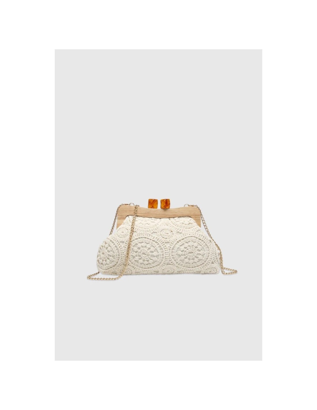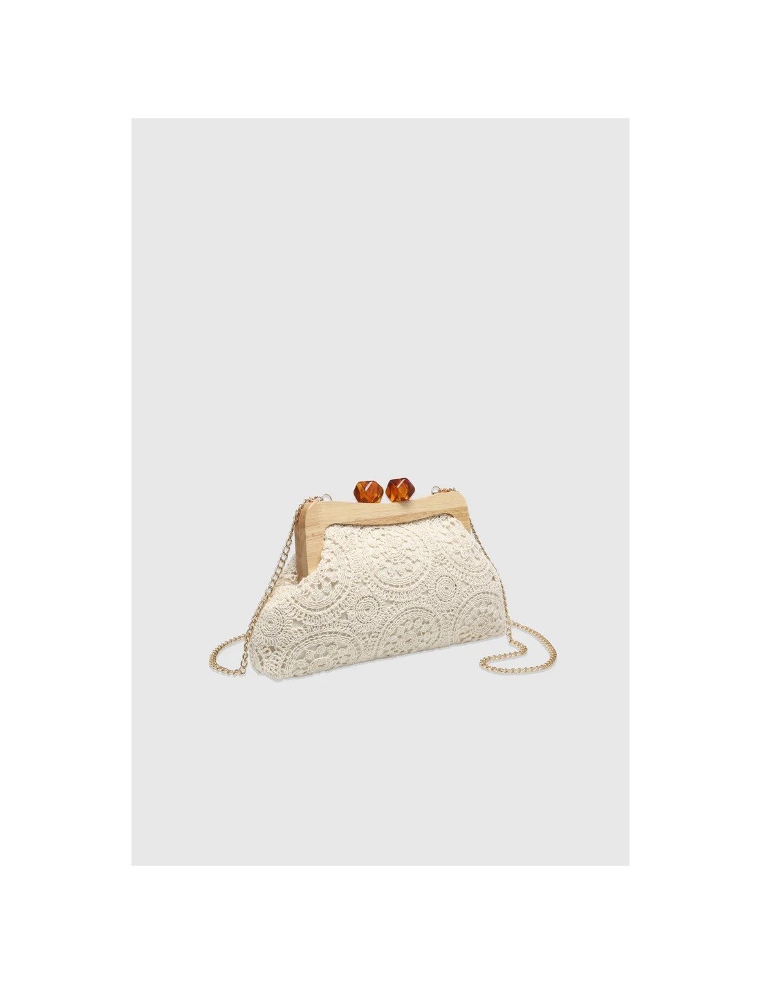 Diseño bordado. Tamaño mediano. Asa de mano en madera. Asa larga de cadena extraíble. Piedra decorativa.