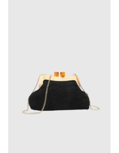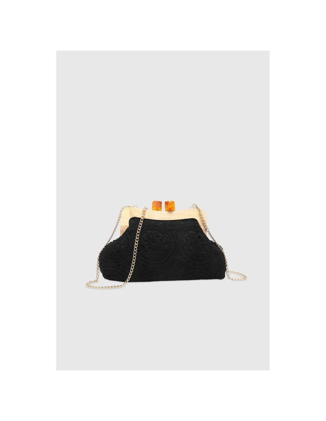 • Diseño bordado. Tamaño mediano. Asa de mano en madera. Asa larga de cadena extraíble. Piedra decorativa.