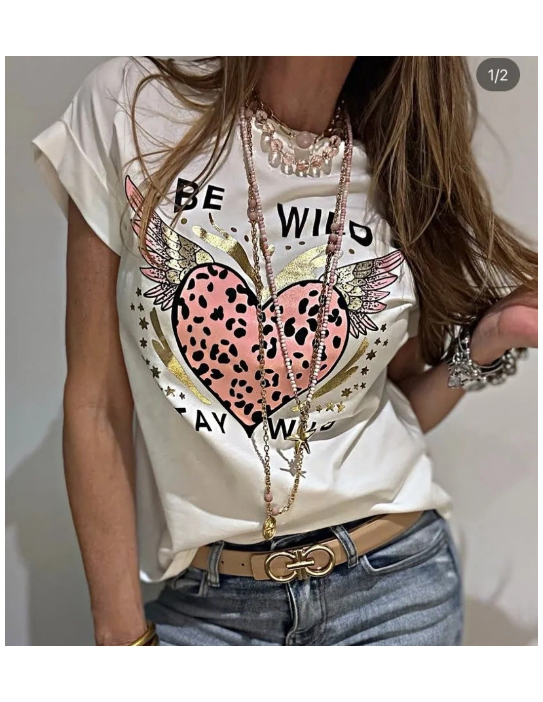 • Un gran Corazón Rosa con un fondo de Animal Print, caracteriza a esta camiseta.