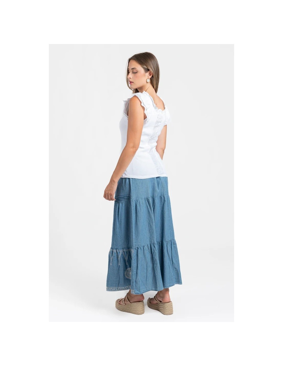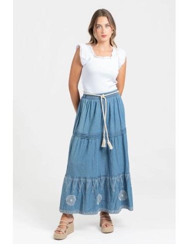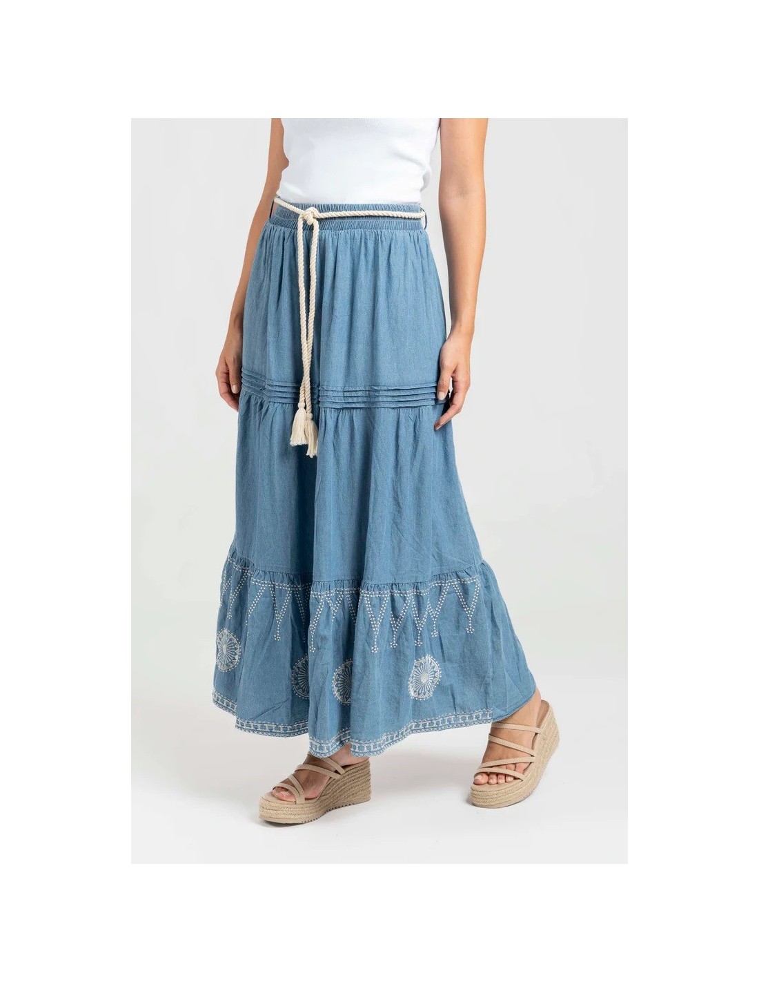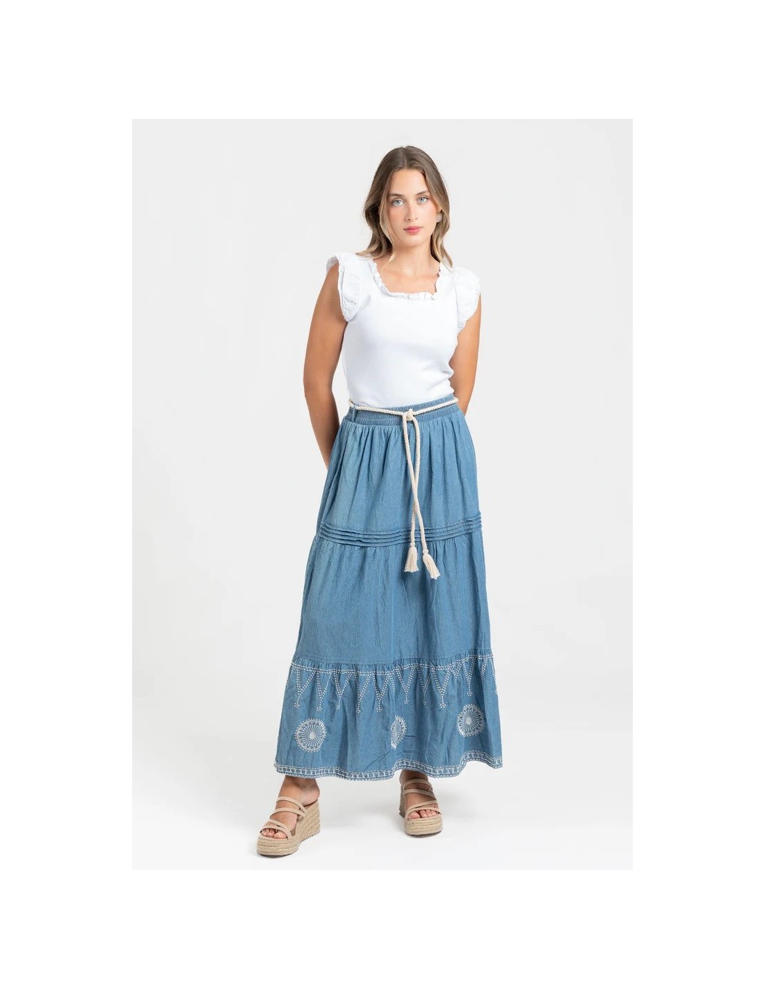 • Diseño midi. Tiro alto. Cintura elástica. Detalle bordados. Cinturón cordón combinado.