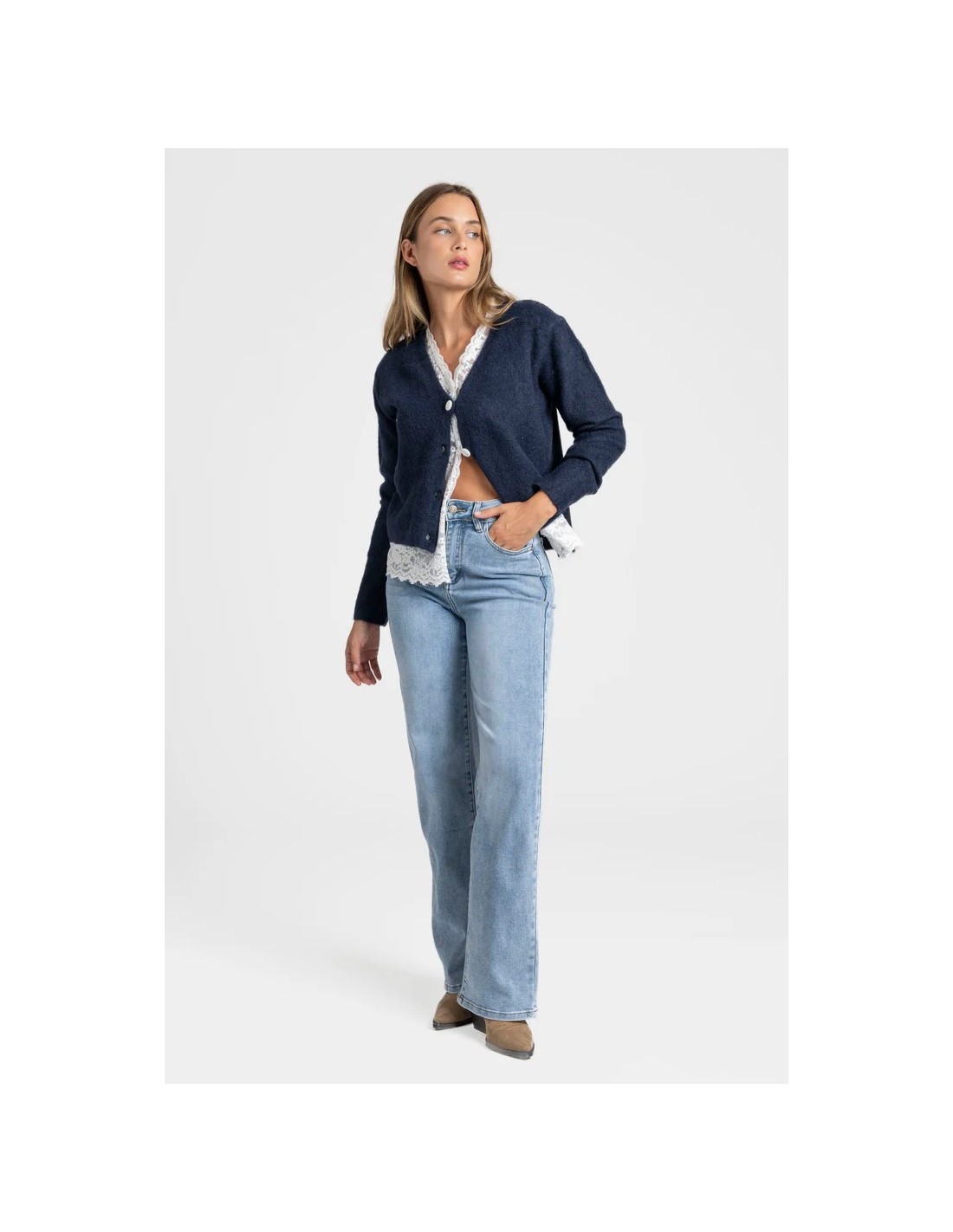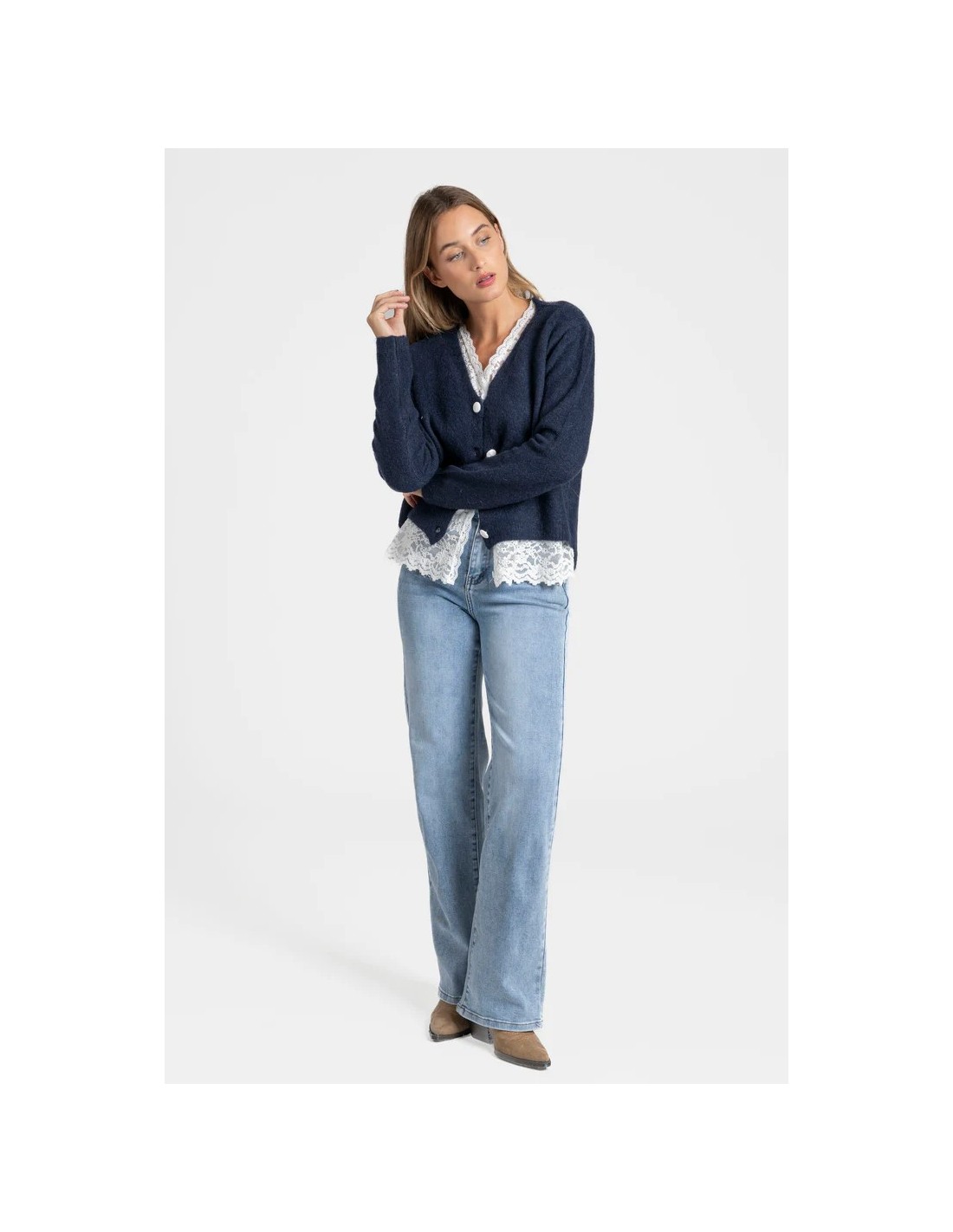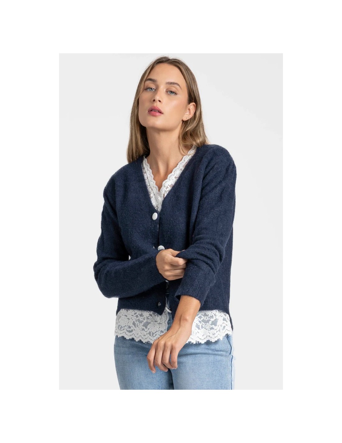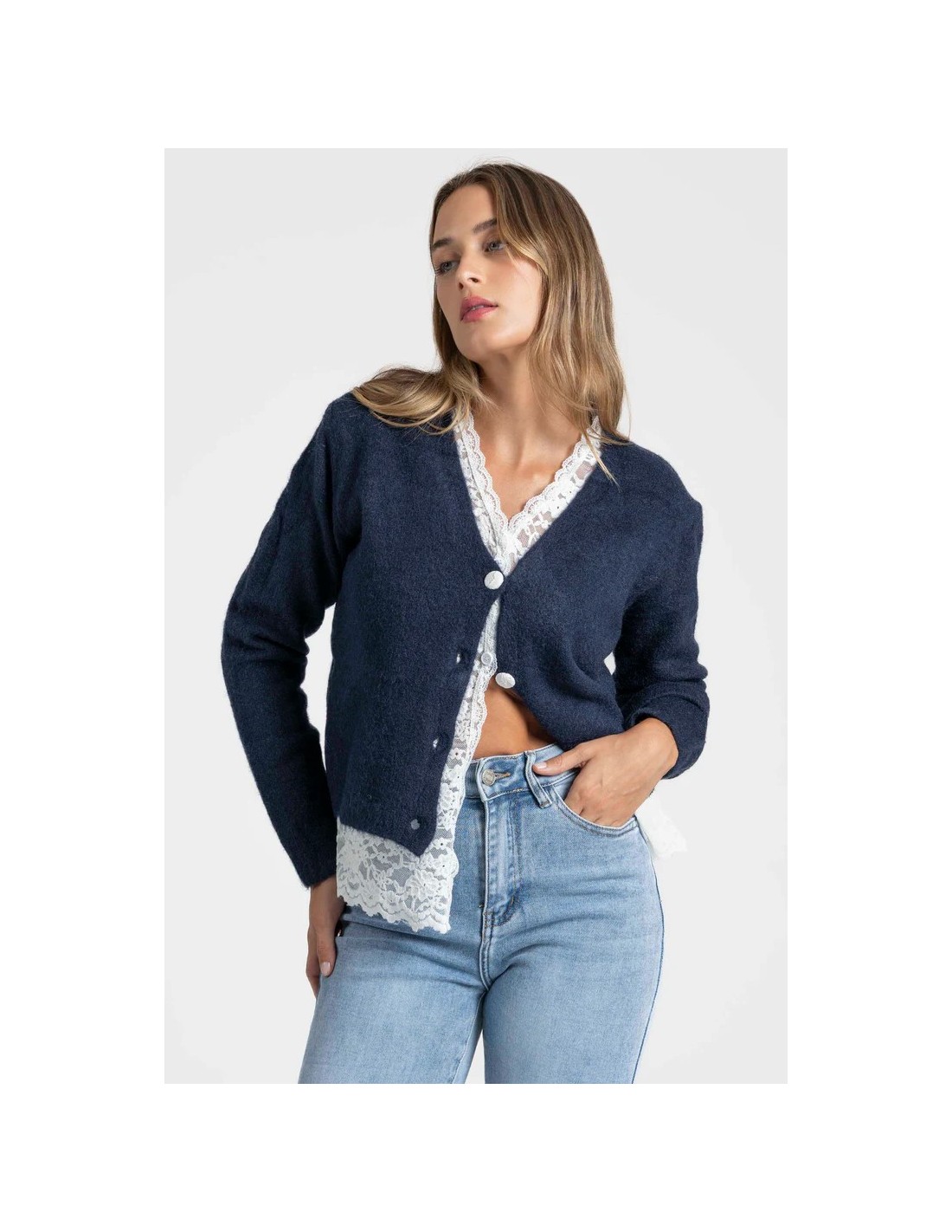 Efecto doble. Detalle encaje. Cierre con botones.