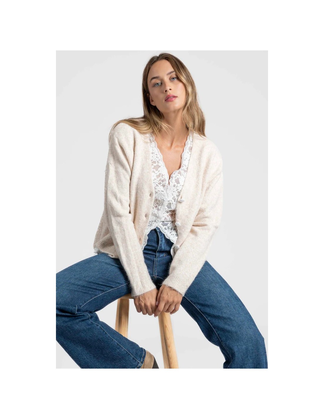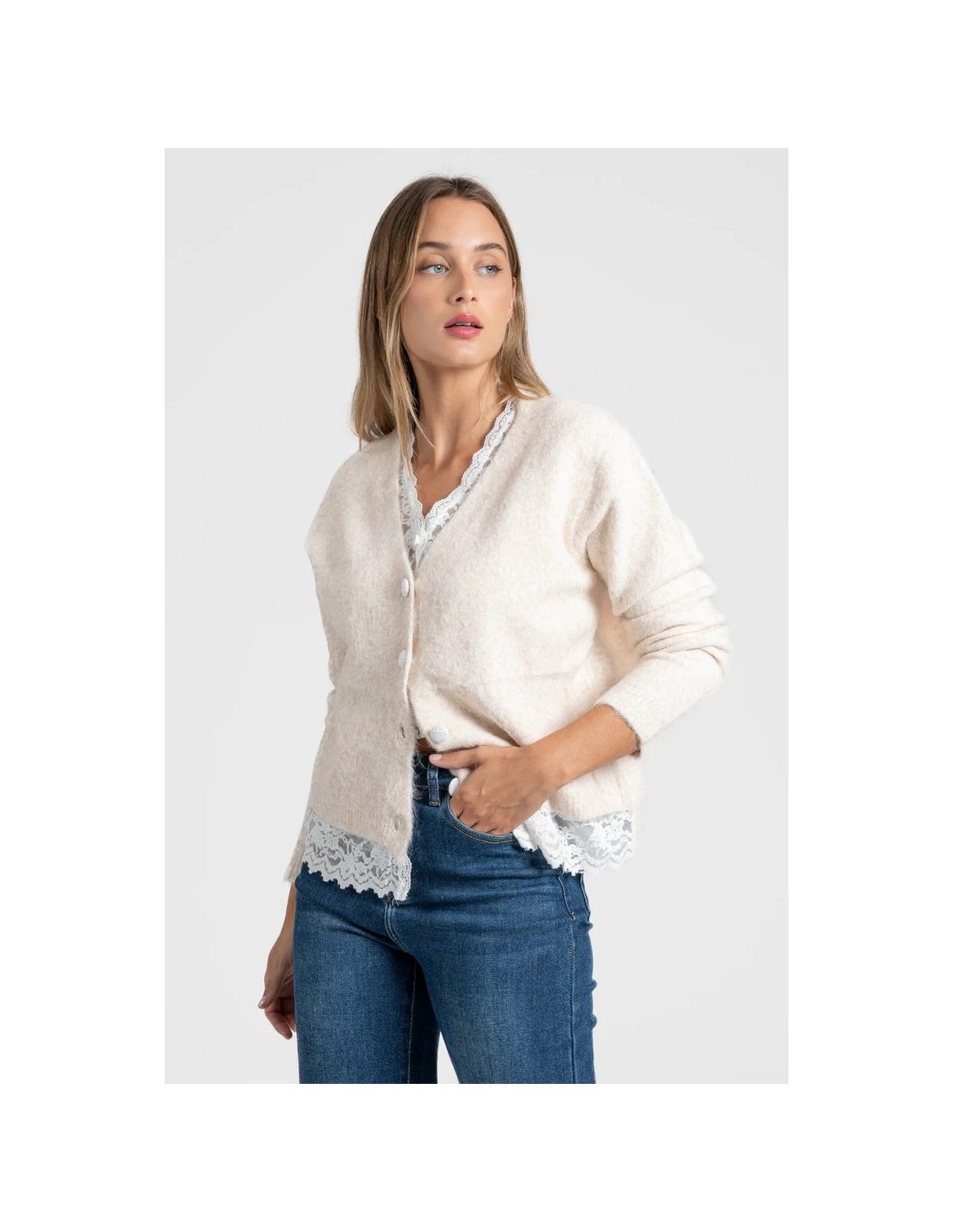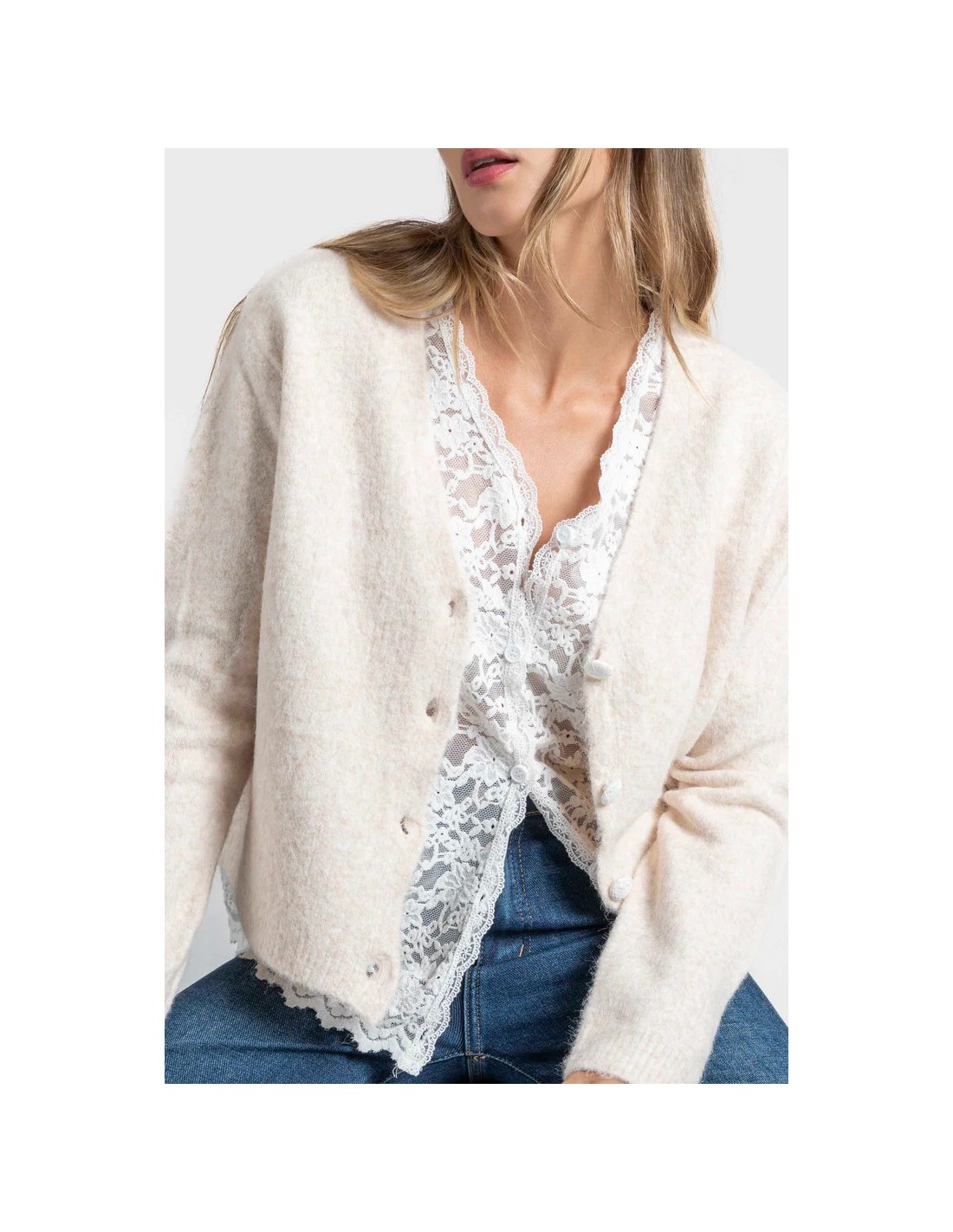 Efecto doble. Detalle encaje. Cierre con botones.