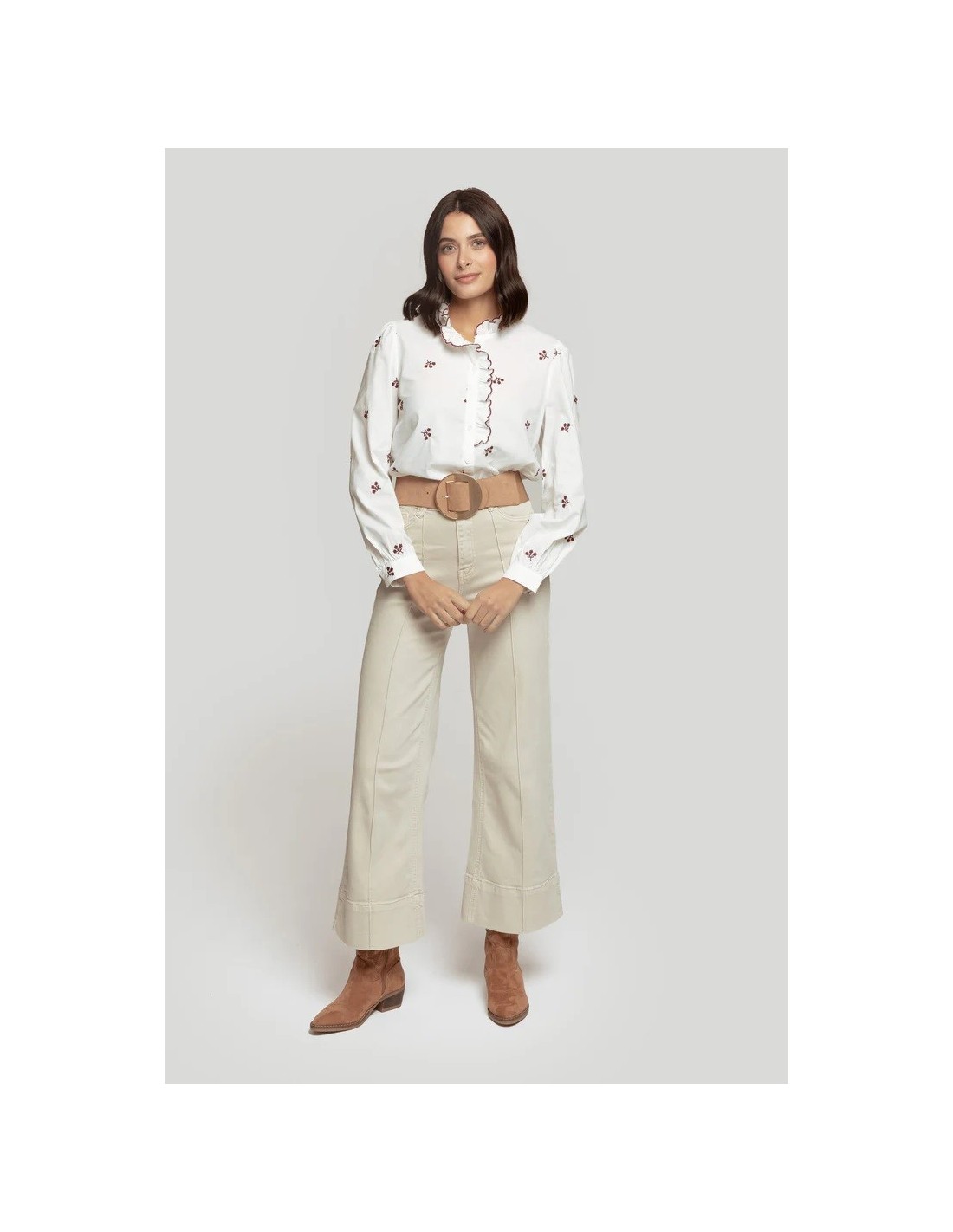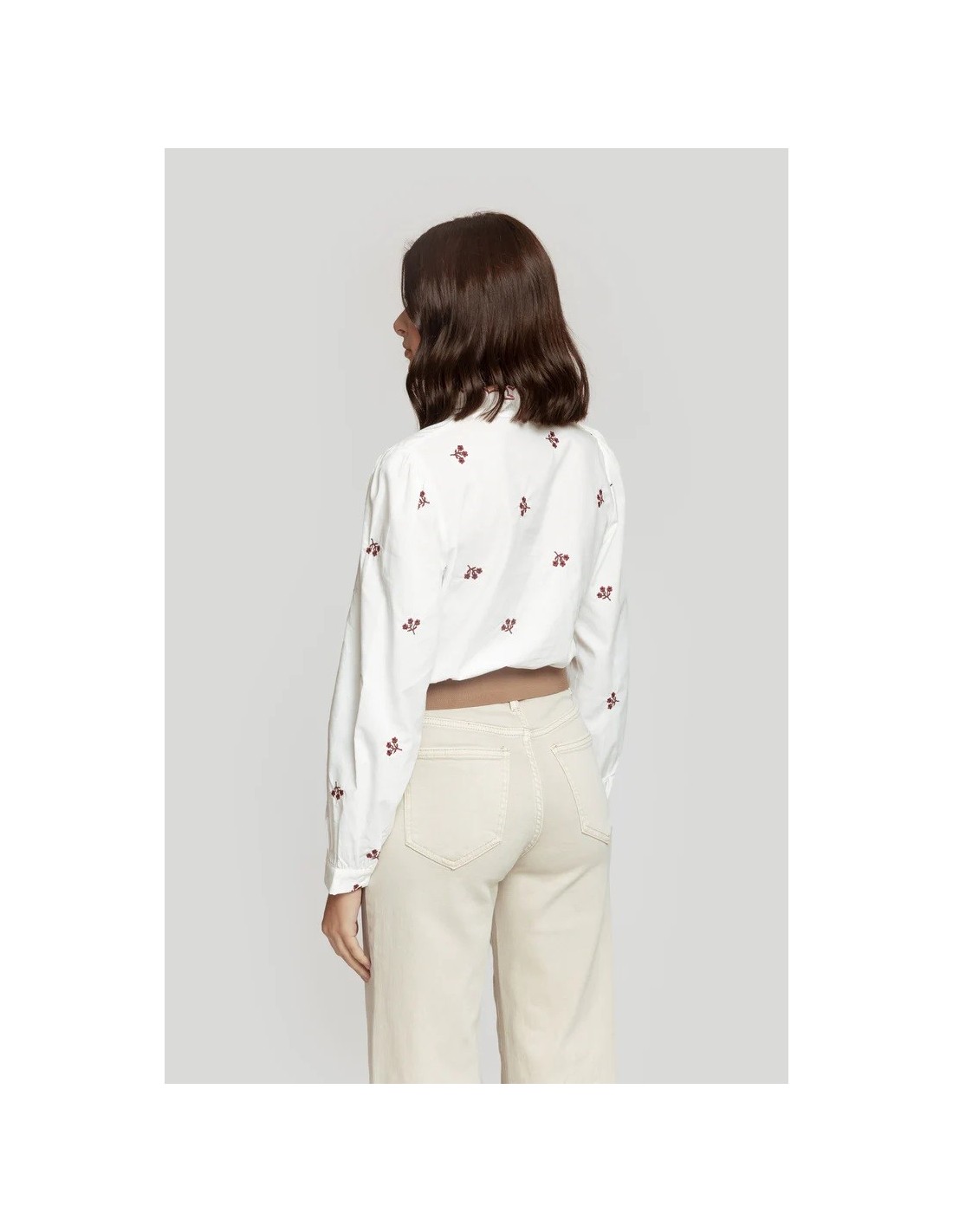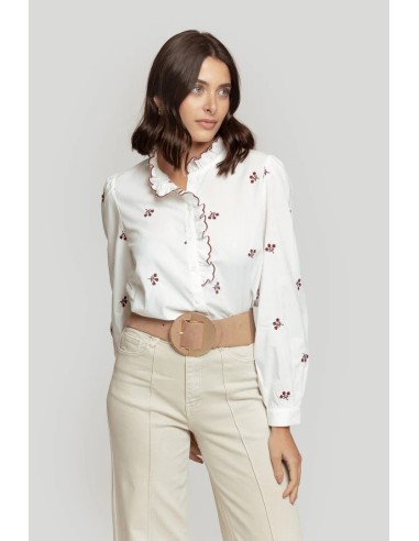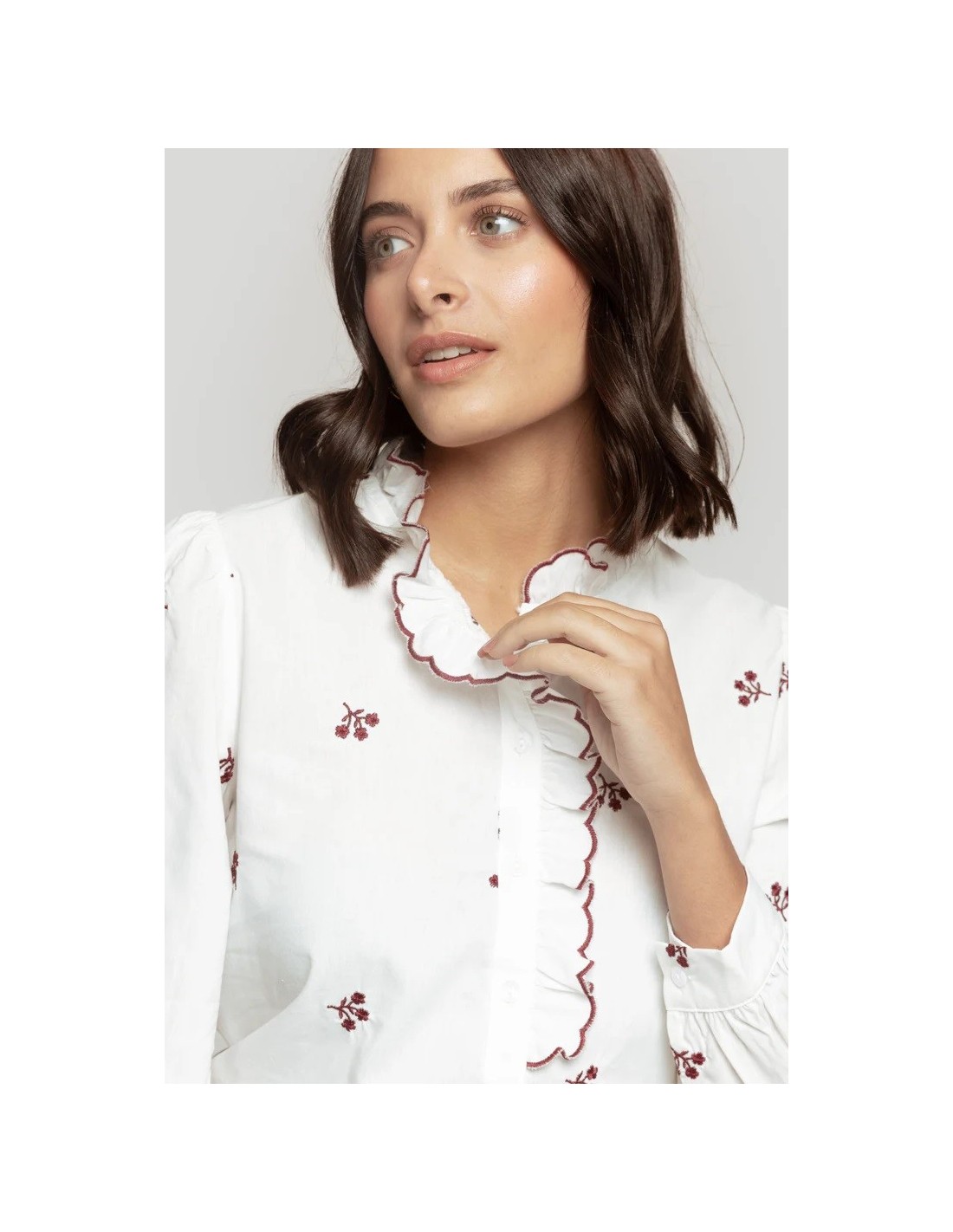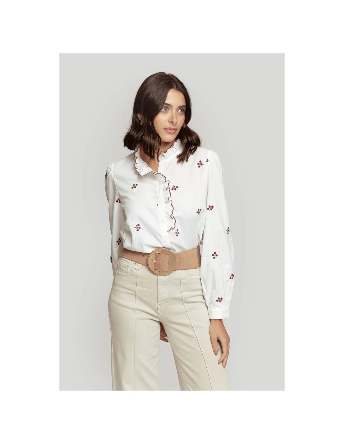 • Camisa de algodón Blanca con estampado de flores bordados granates.
