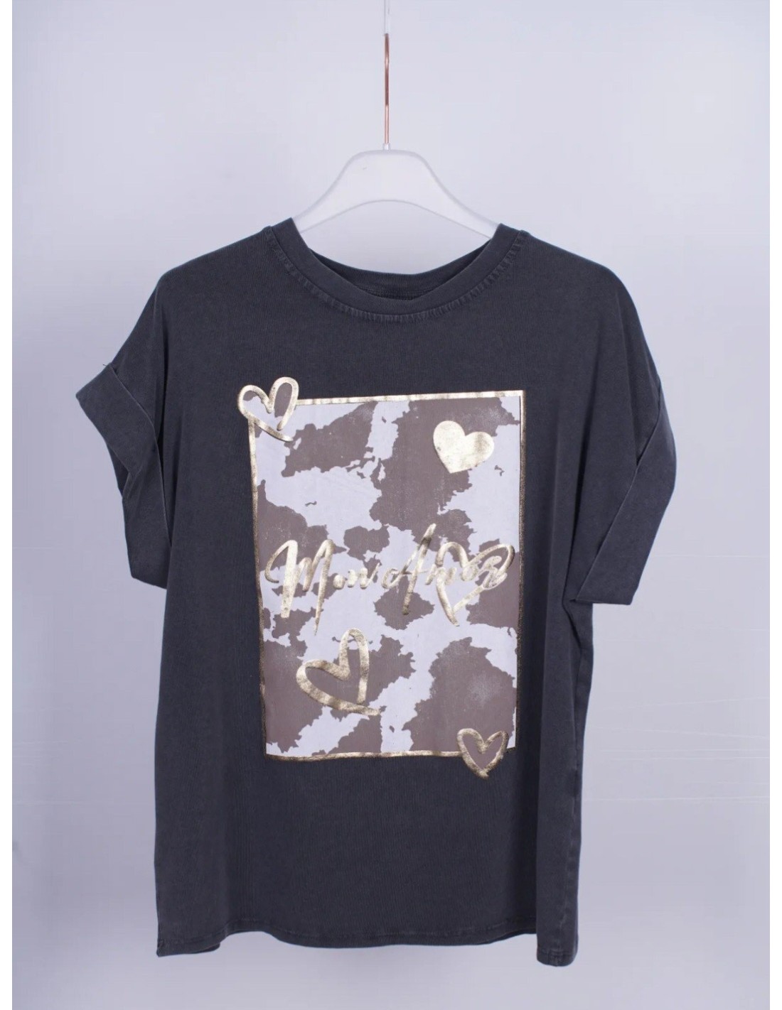 - Estampado de tonos dorados y taupe con las palabras Mon Amour.