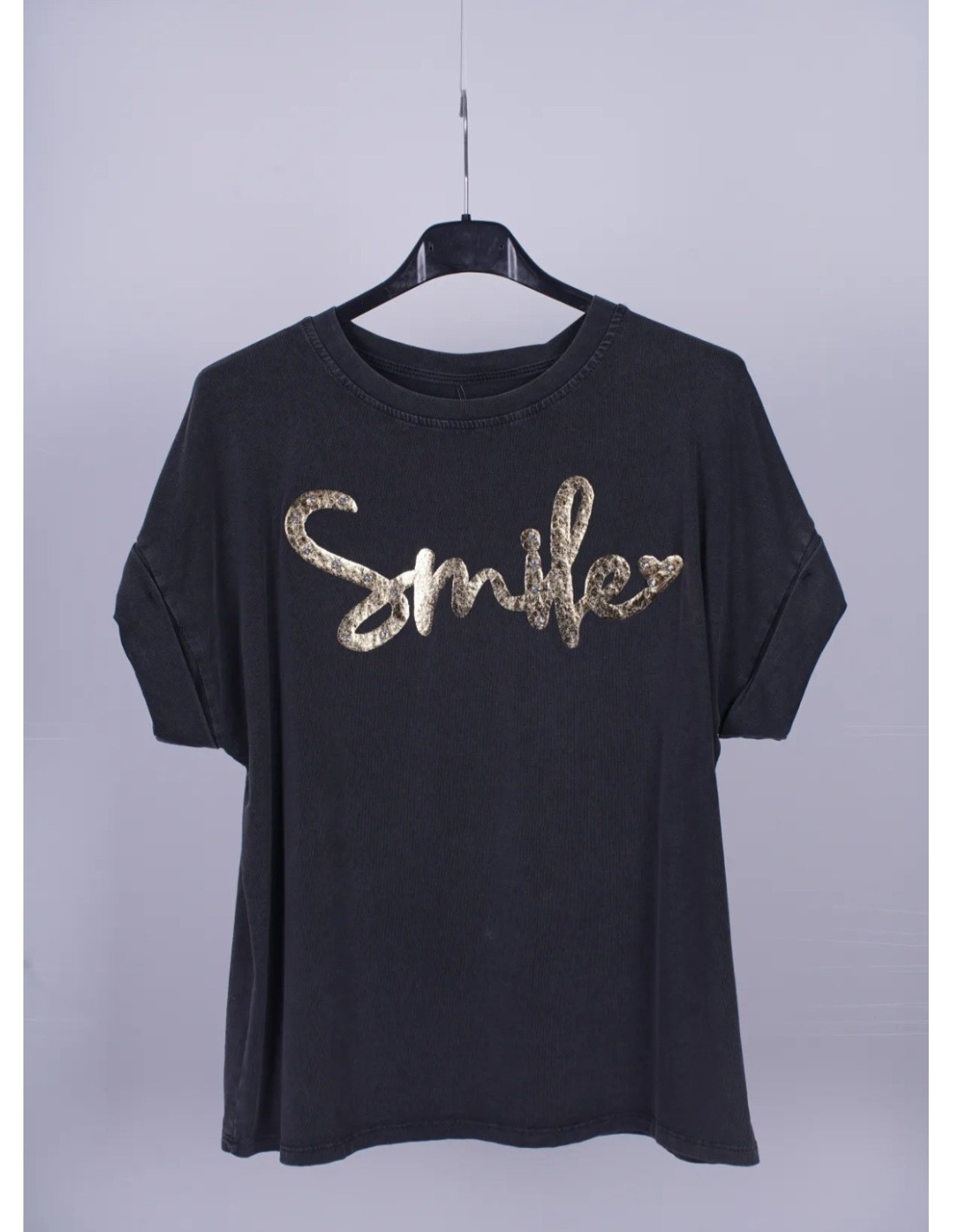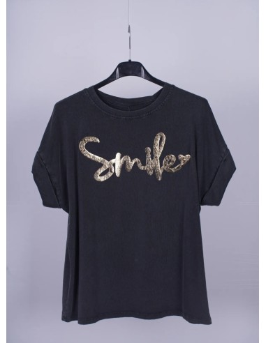 - Color Gris desgastado con la parte frontal estampada con la palabra SMILE en Dorado.