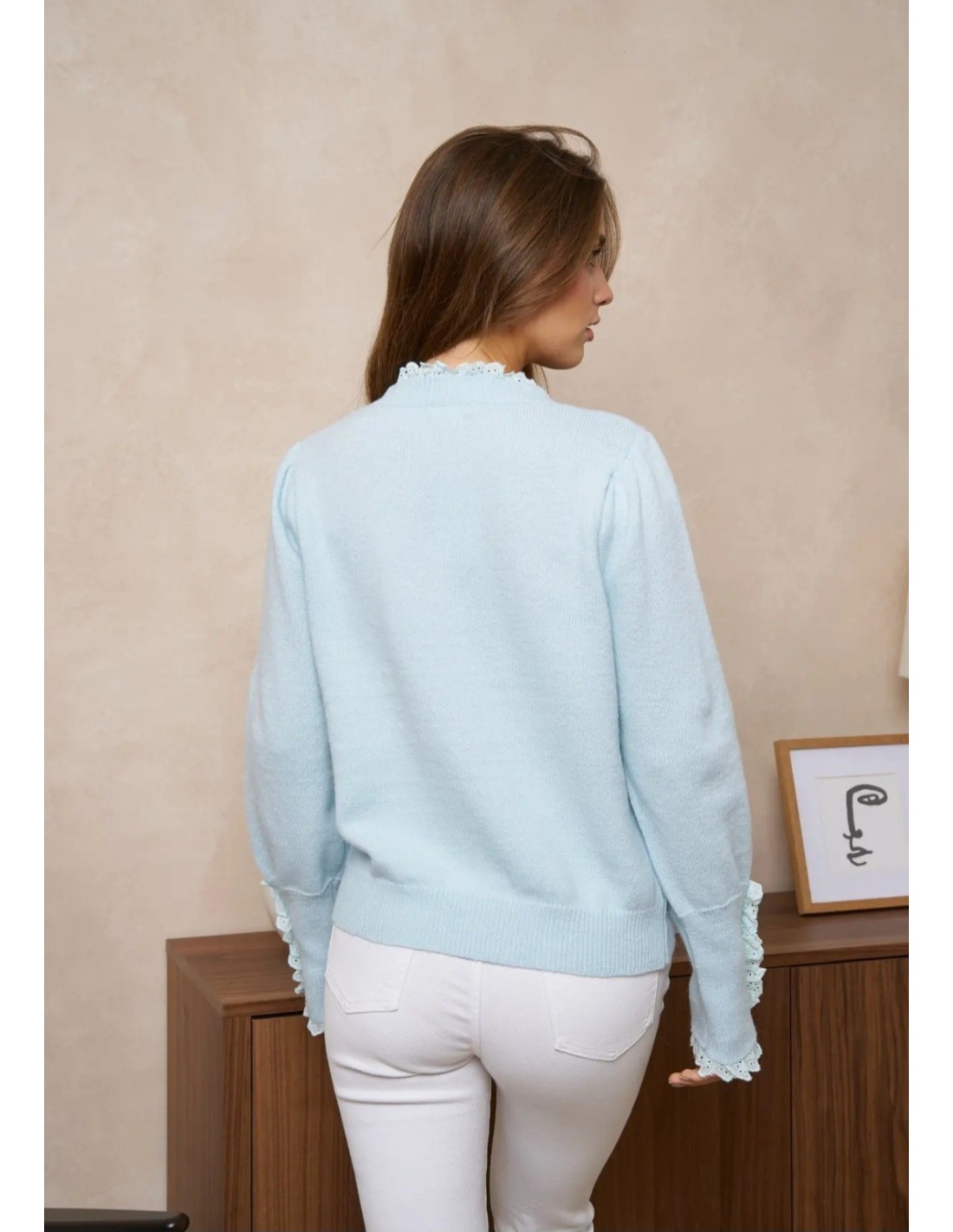 - Jersey de cuello redondo adornado con puntilla.