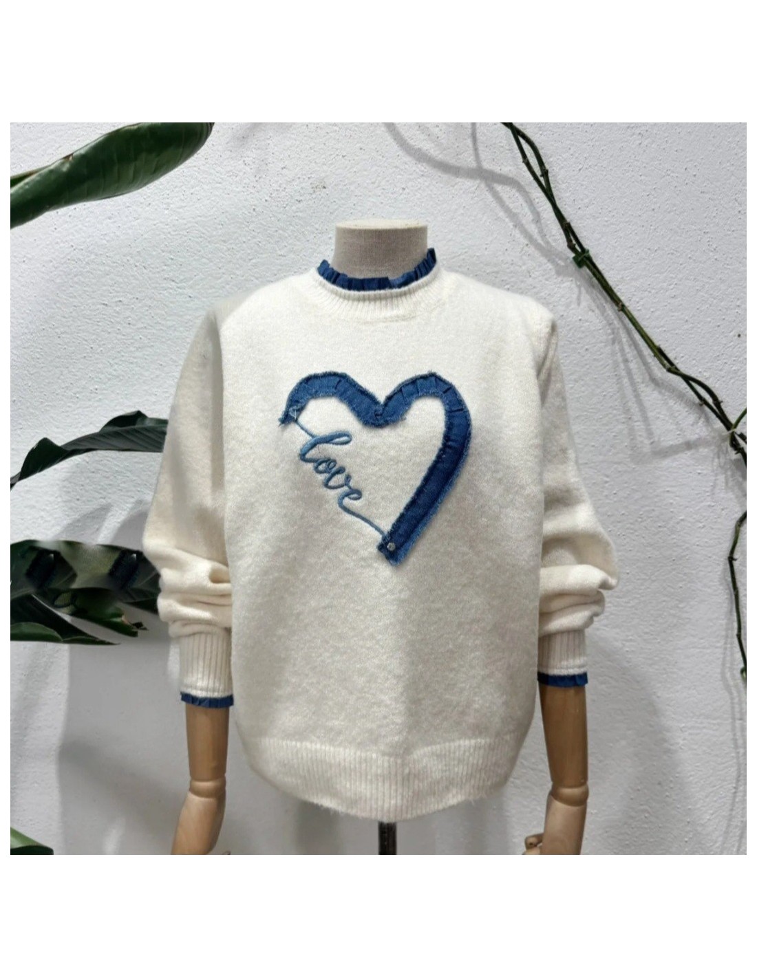 - Precioso jersey Beige con detalles Vaqueros en Puños, Cuello y parte delantera con corazón vaquero y palabra LOVE.