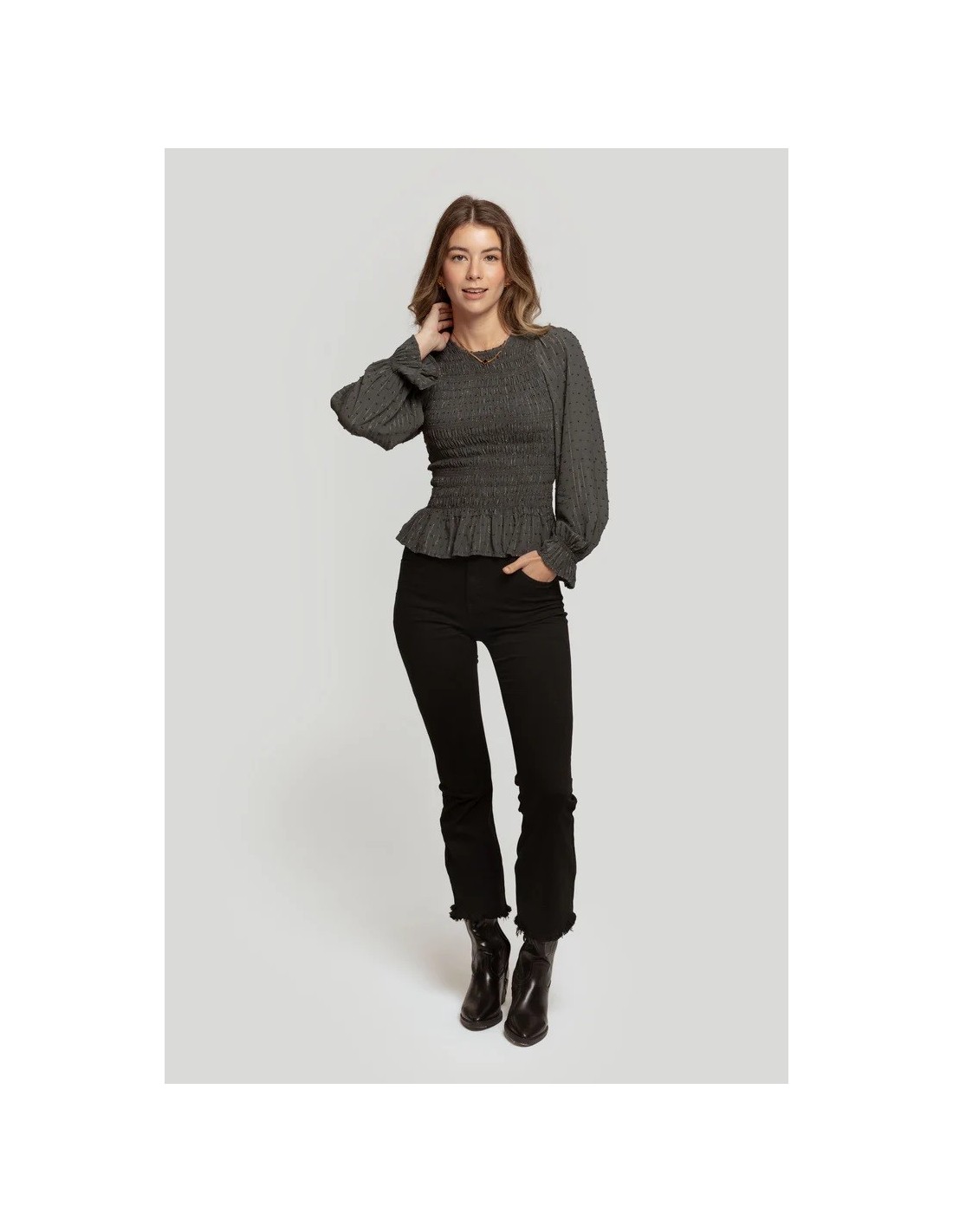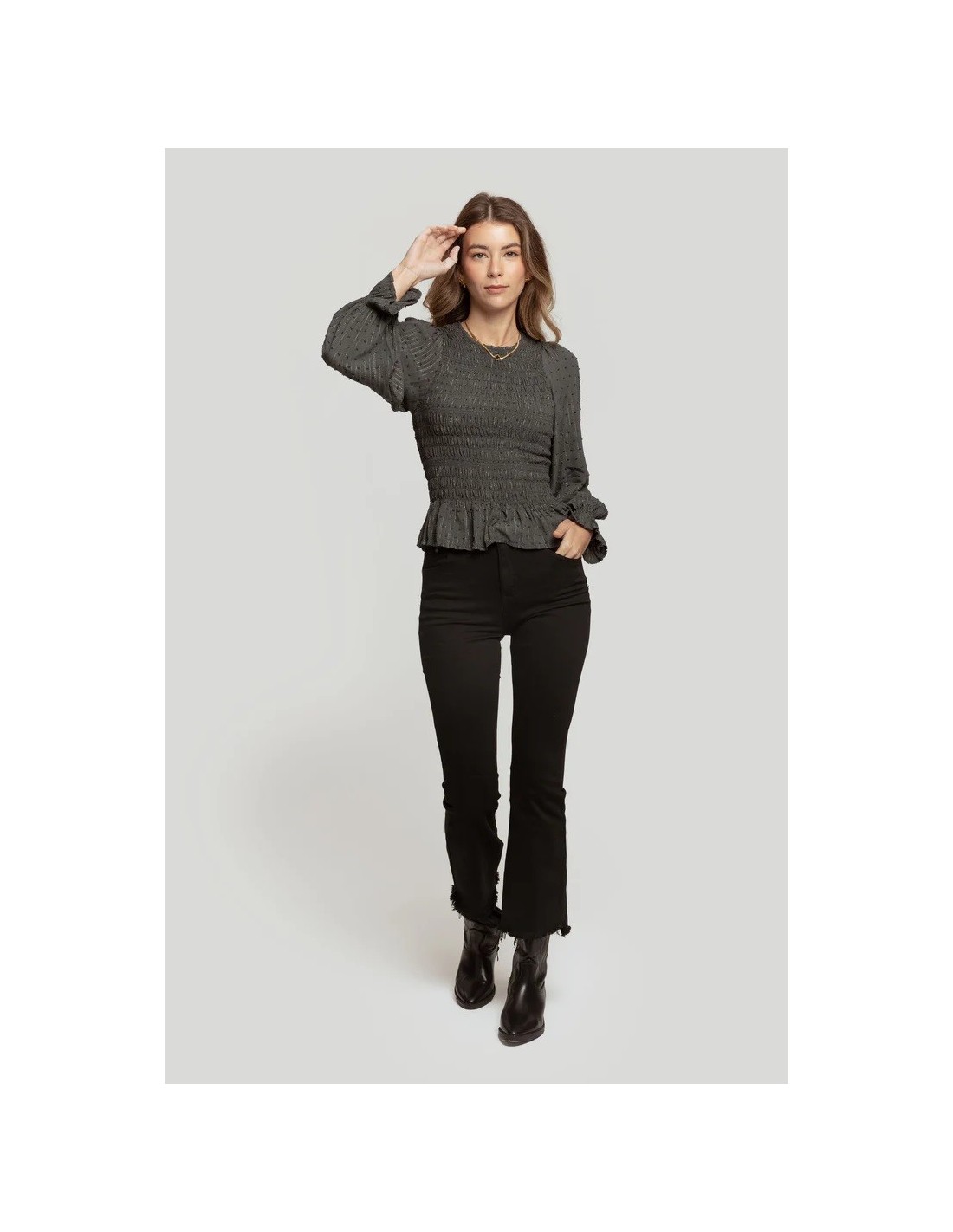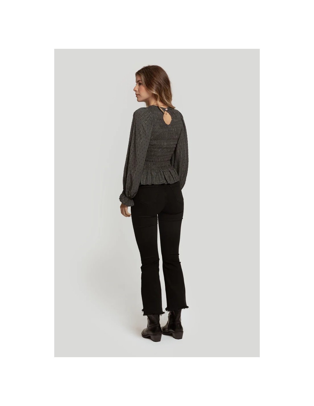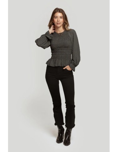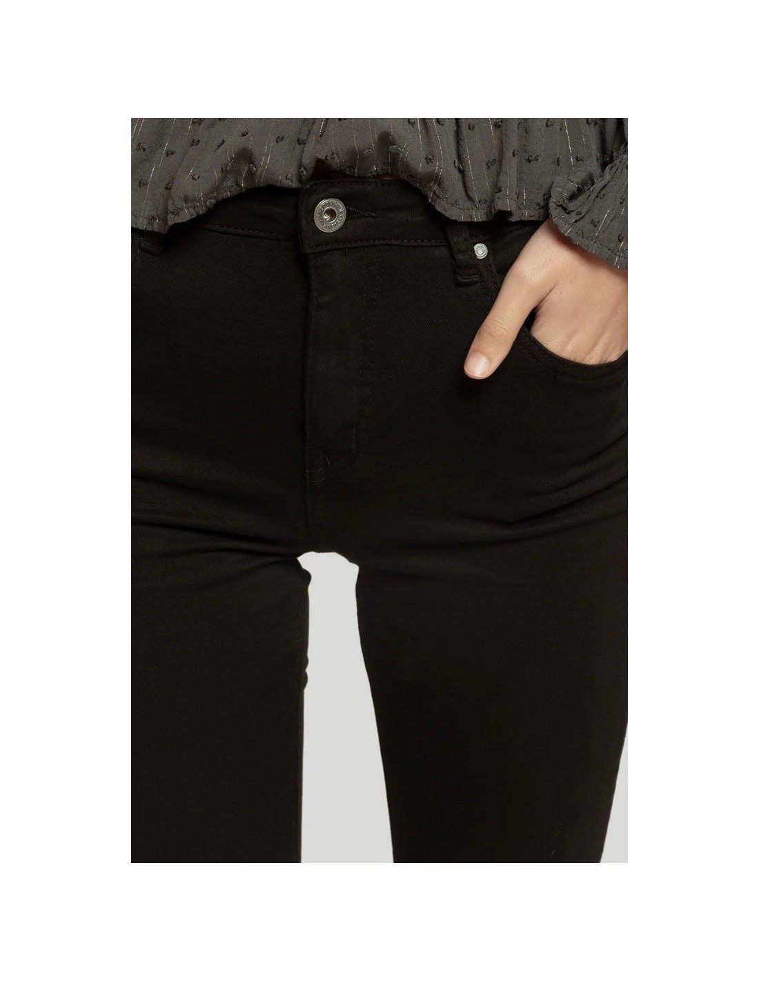 Tejido tejano vaquero. Tiro alto. Tejido con elástico. Diseño flare. Cinco bolsillos. Cierre de cremallera y botón. Trabillas. Bajo sin rematar.