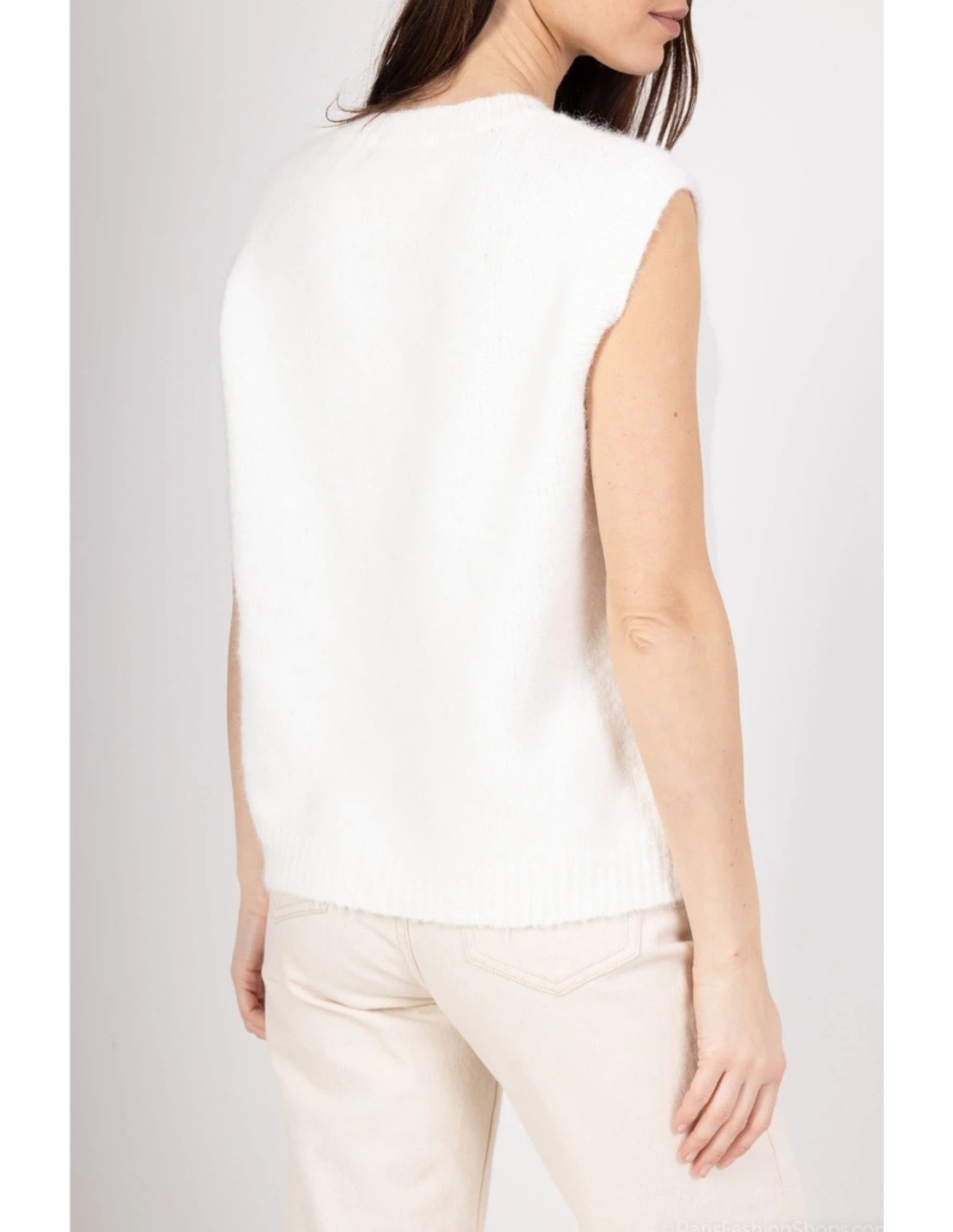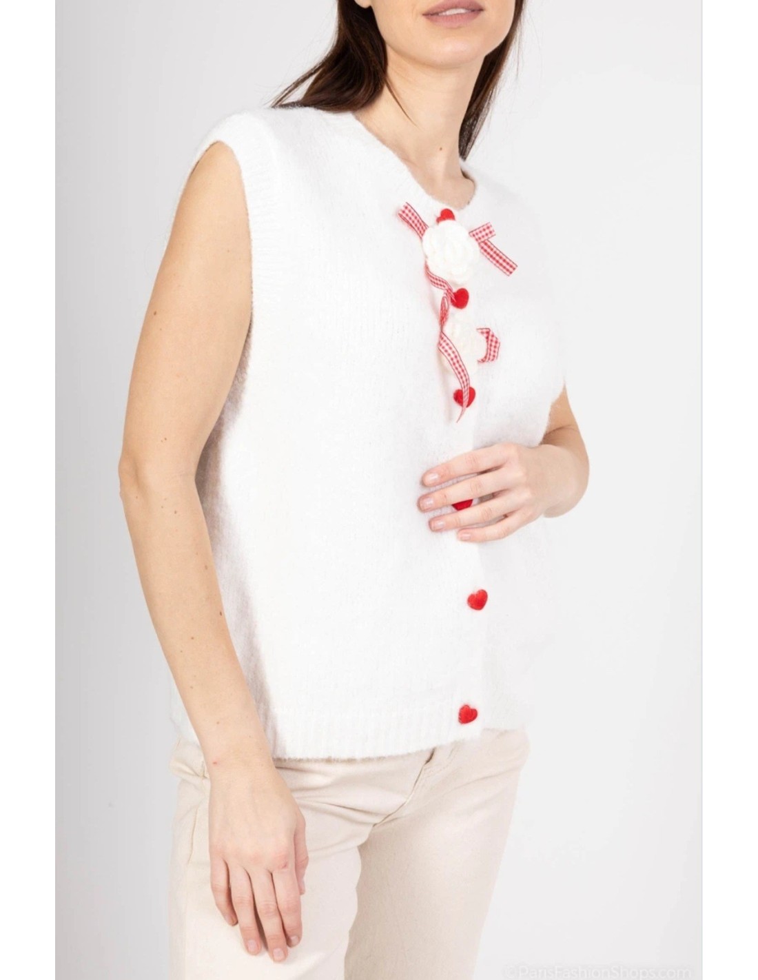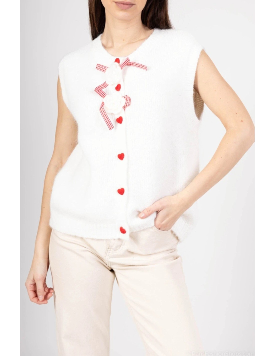- Precioso chaleco de punto Blanco con detalles románticos en Rojo.