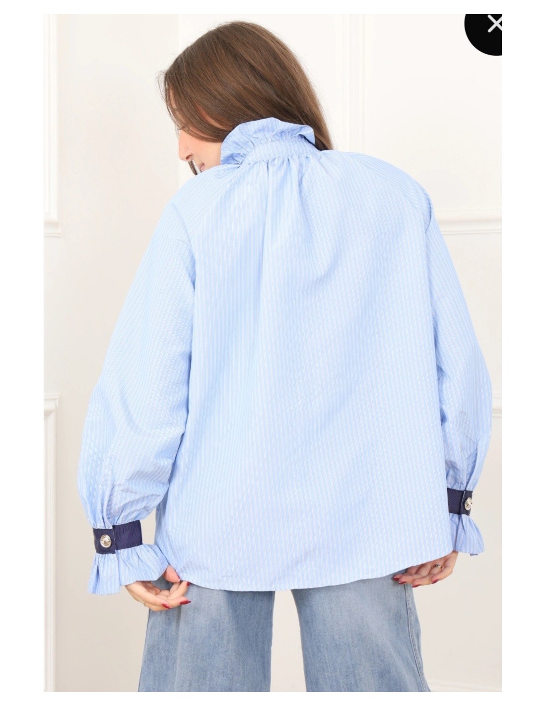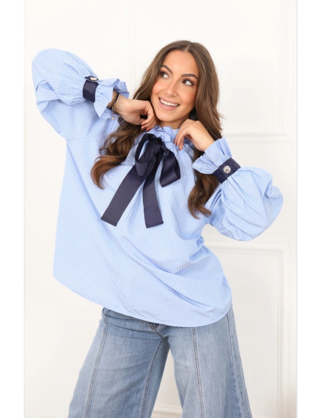 - Puños de volantes y Lazo gigante de adorno al cierre de cuello en Azul Marino.
