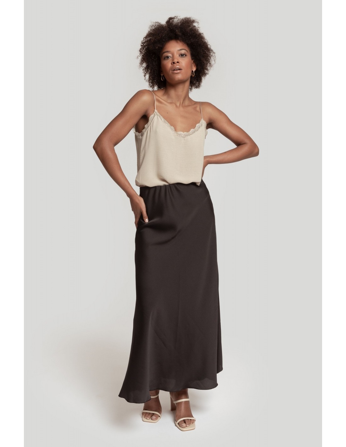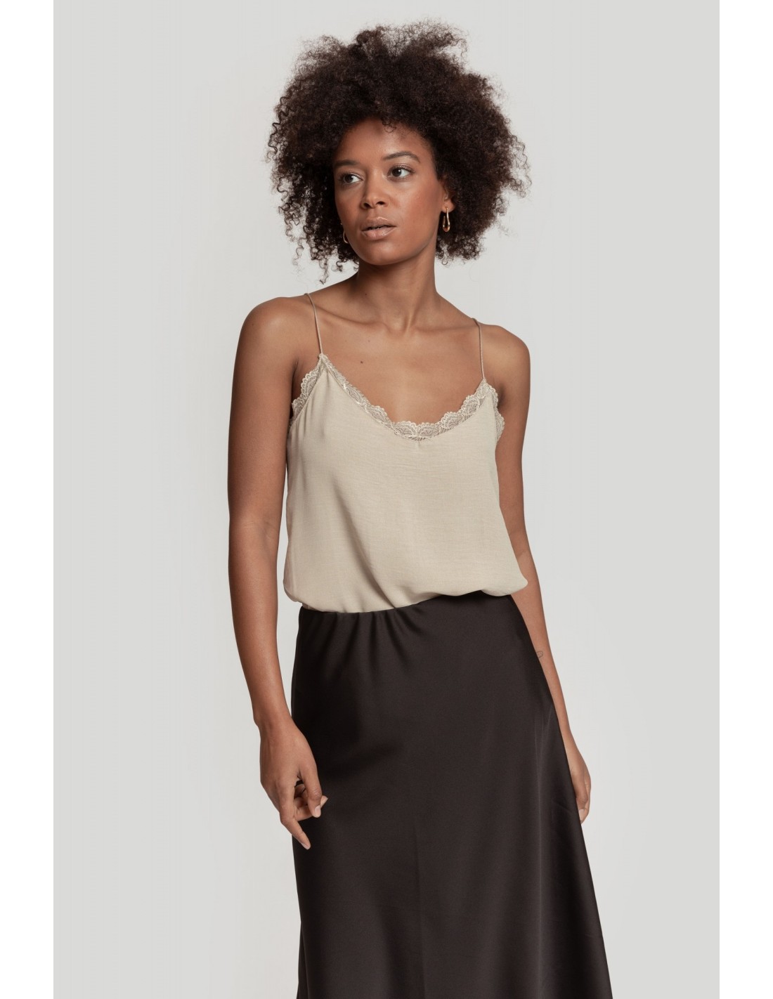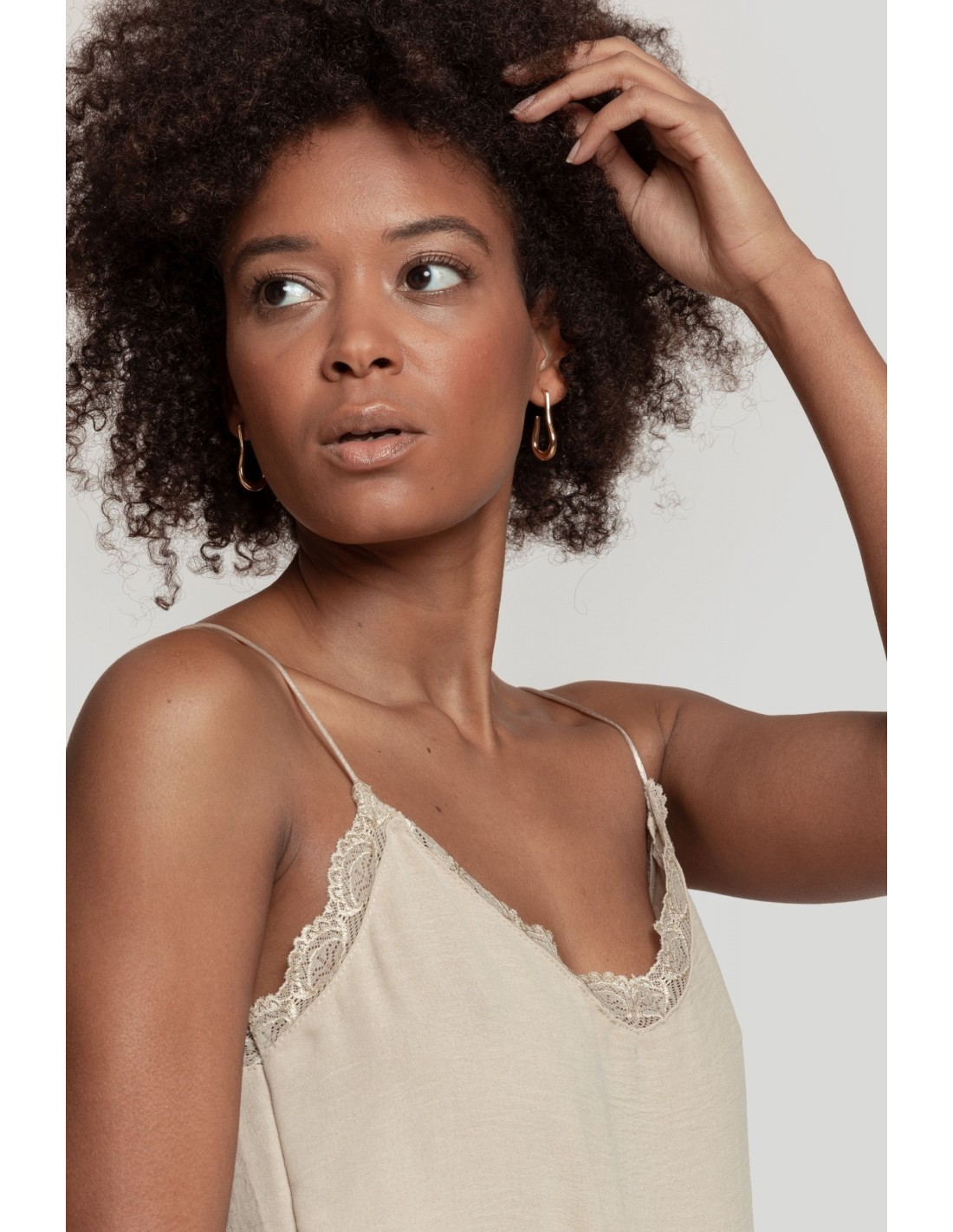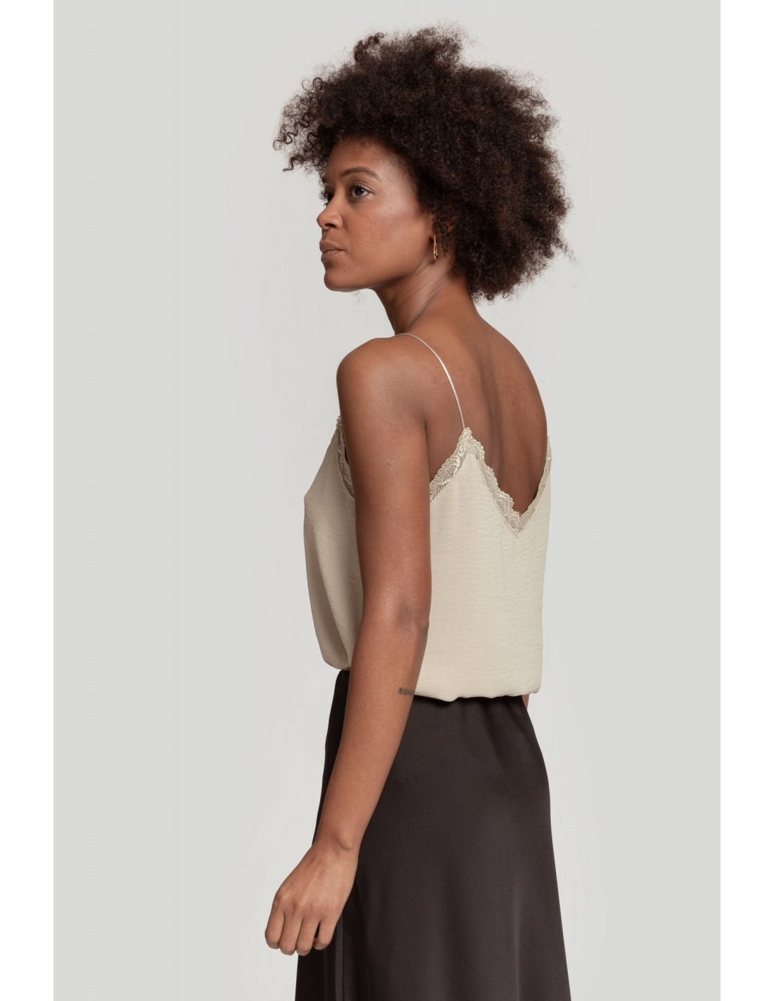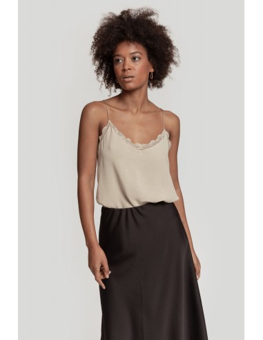 Diseño fluido. Cuello amplio. Tirantes finos. Detalles encaje.