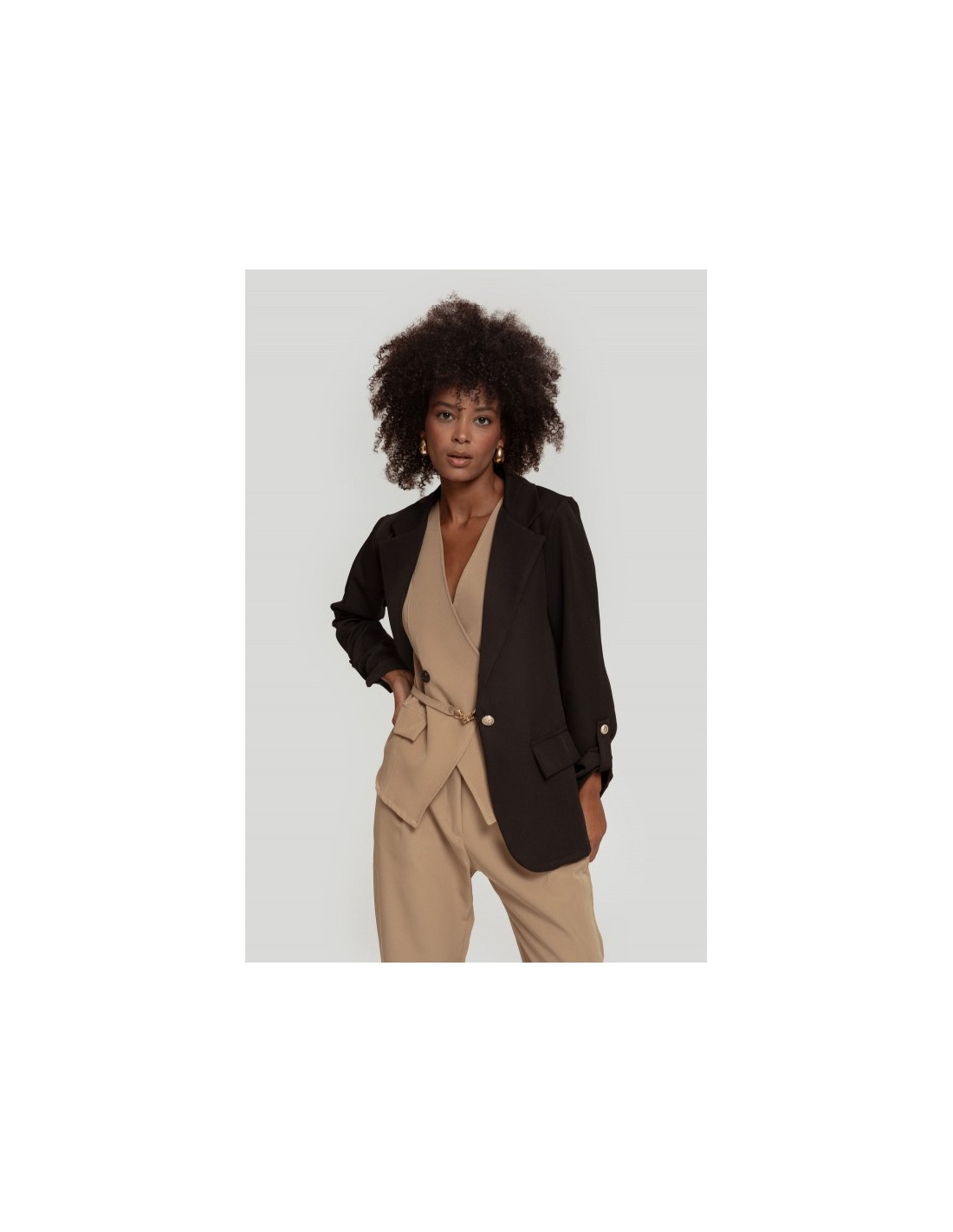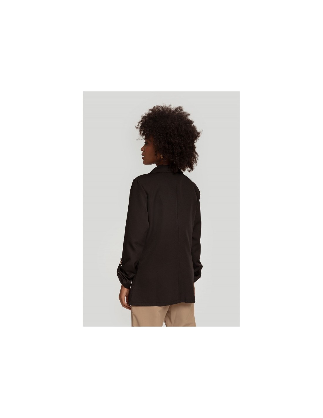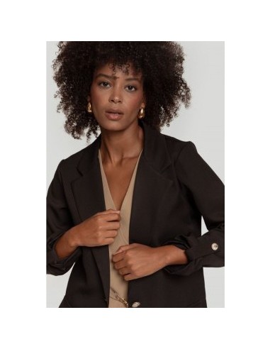 Cuello solapa. Manga por debajo del codo. Acabada en vuelta con botón dorado. Hombros estructurados. Solapa decorativa. Cierre de botón.