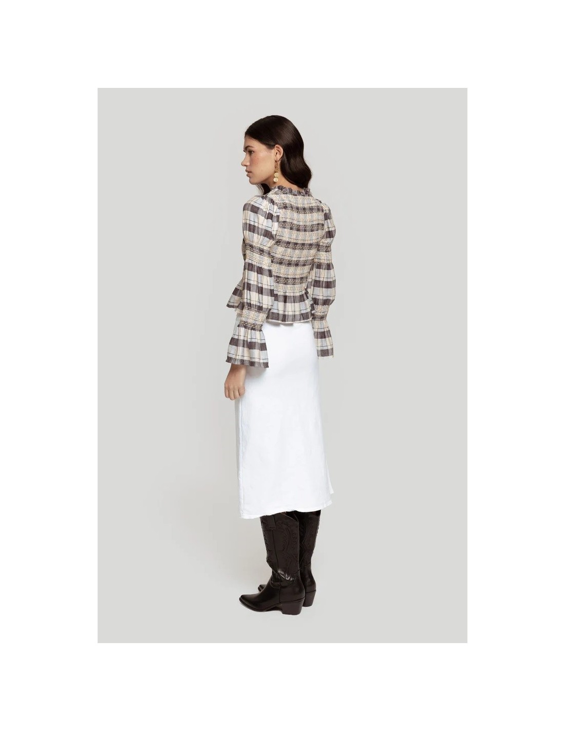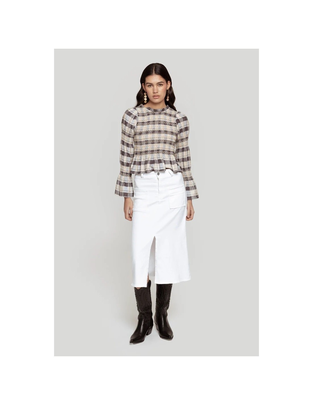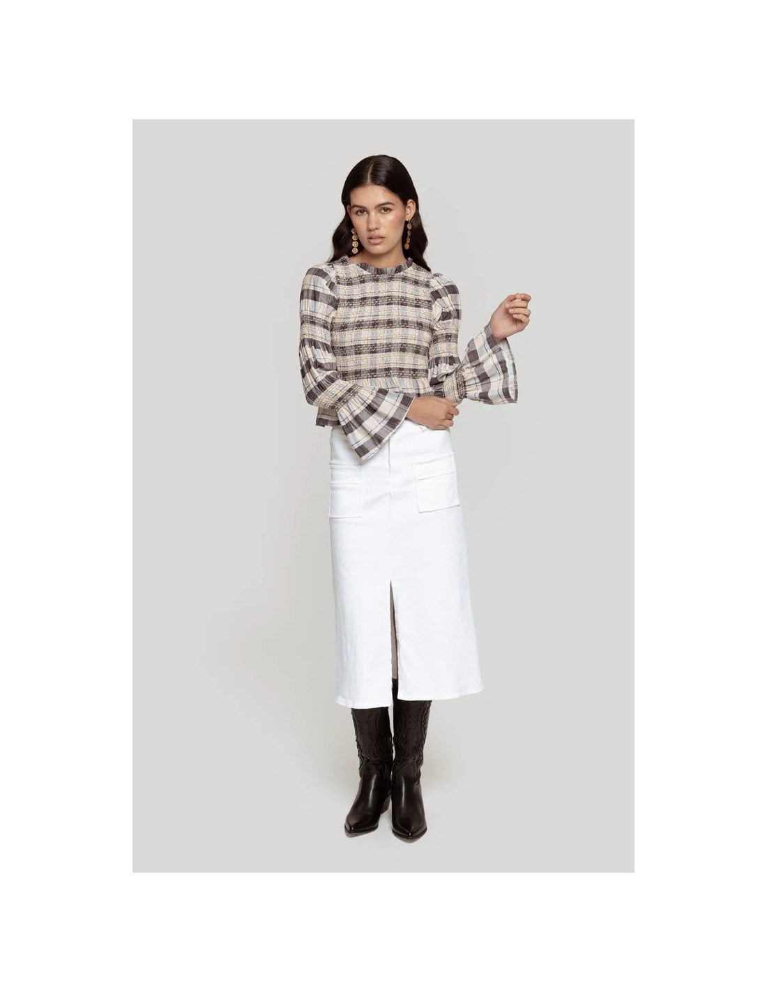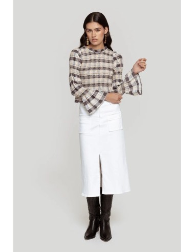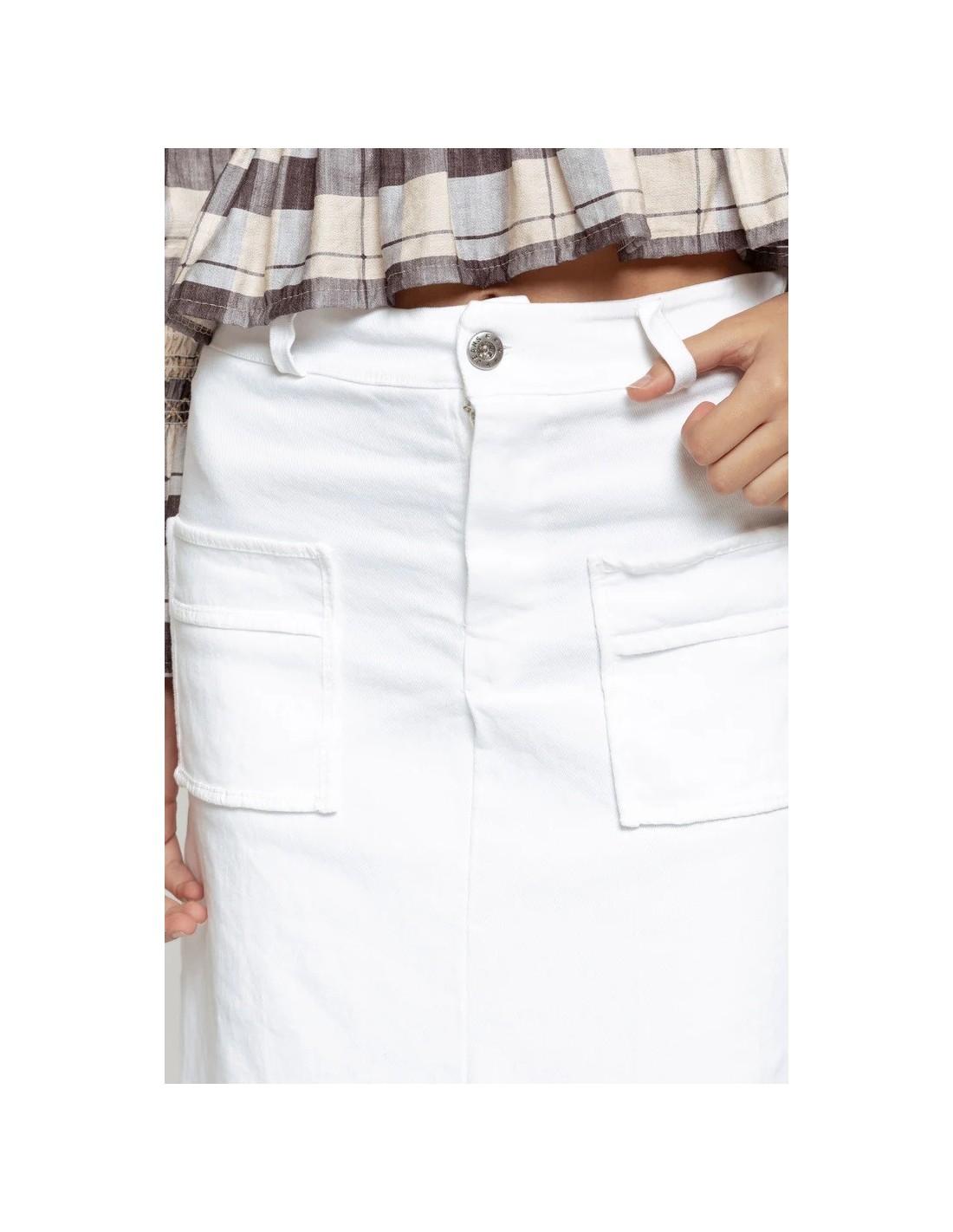 Diseño midi y recto. Tiro medio. Cierre de cremallera. Bolsillos frontales. Con trabillas. Abertura frontal.