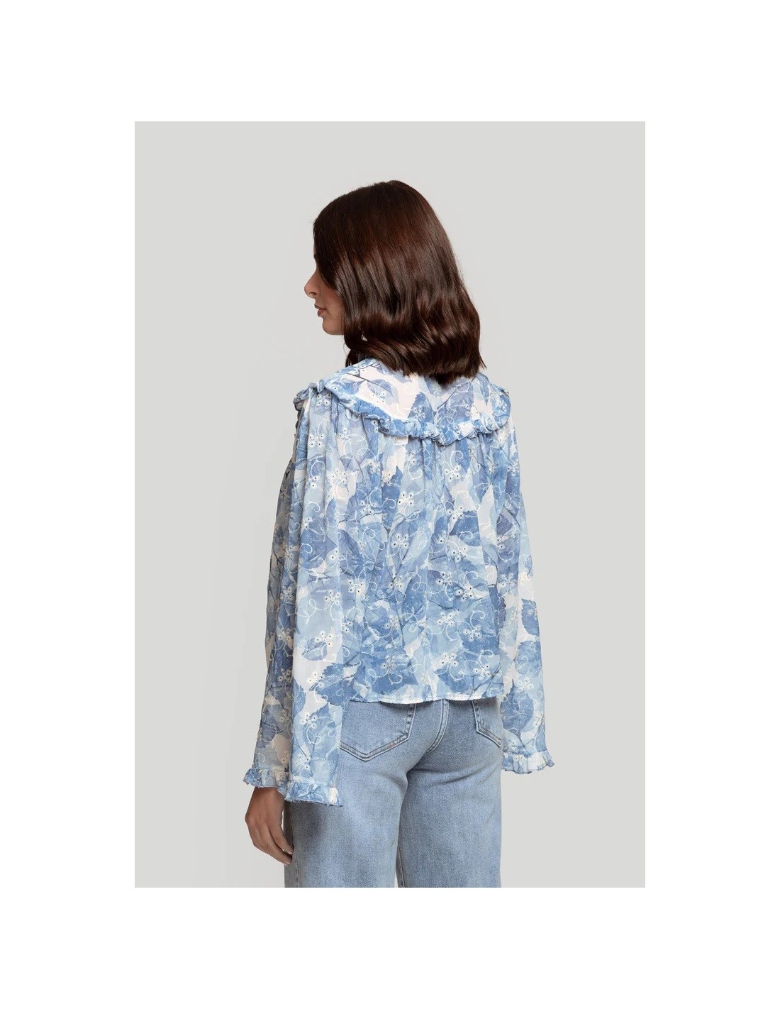 Amplia, con corte recto. Cuello redondo. Cuello pico. Manga larga. Puño volantes. Cierre de botón en cuello. Semitransparente.