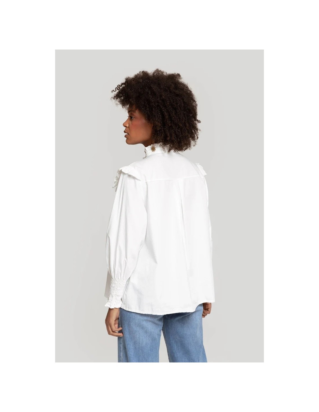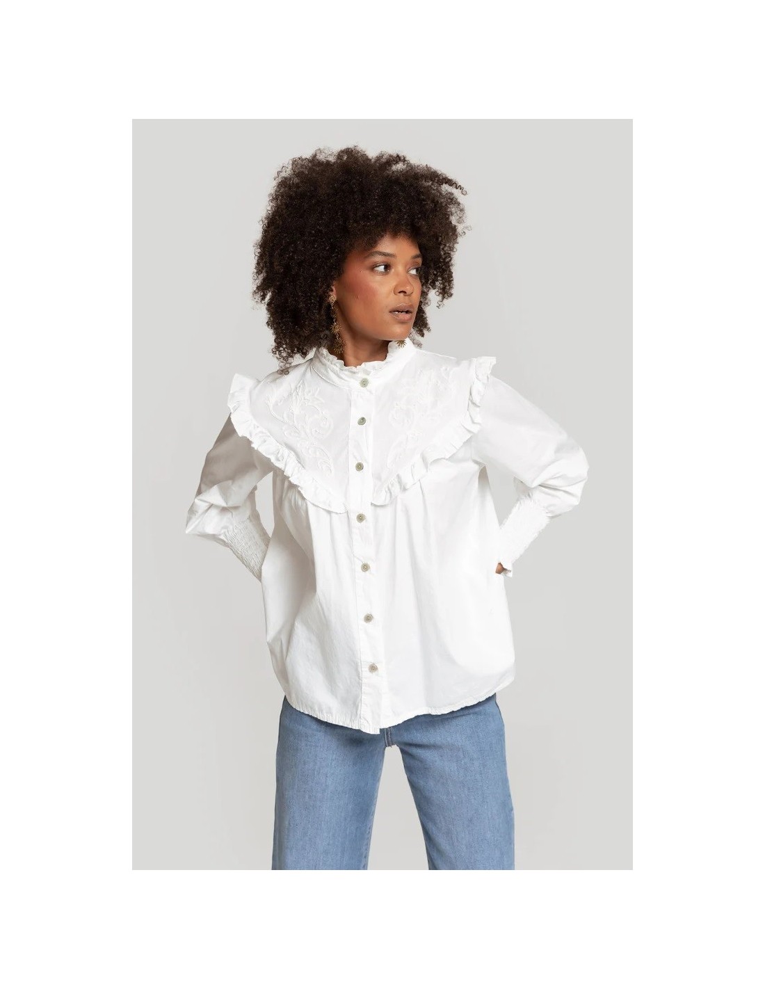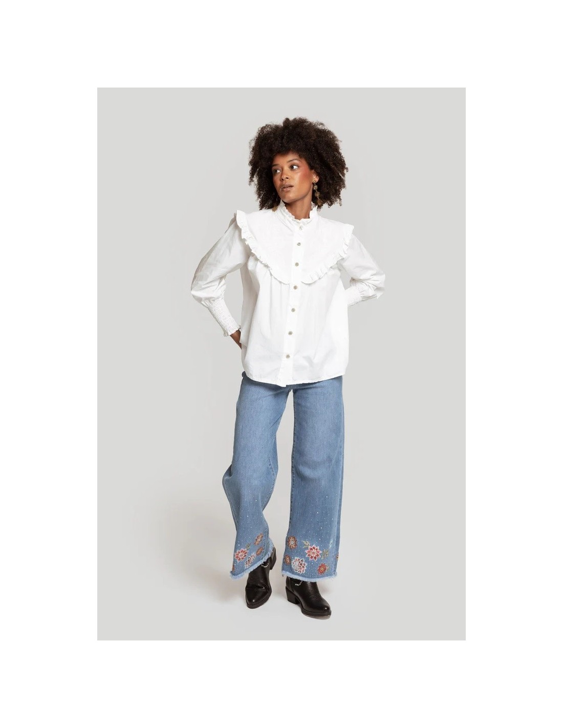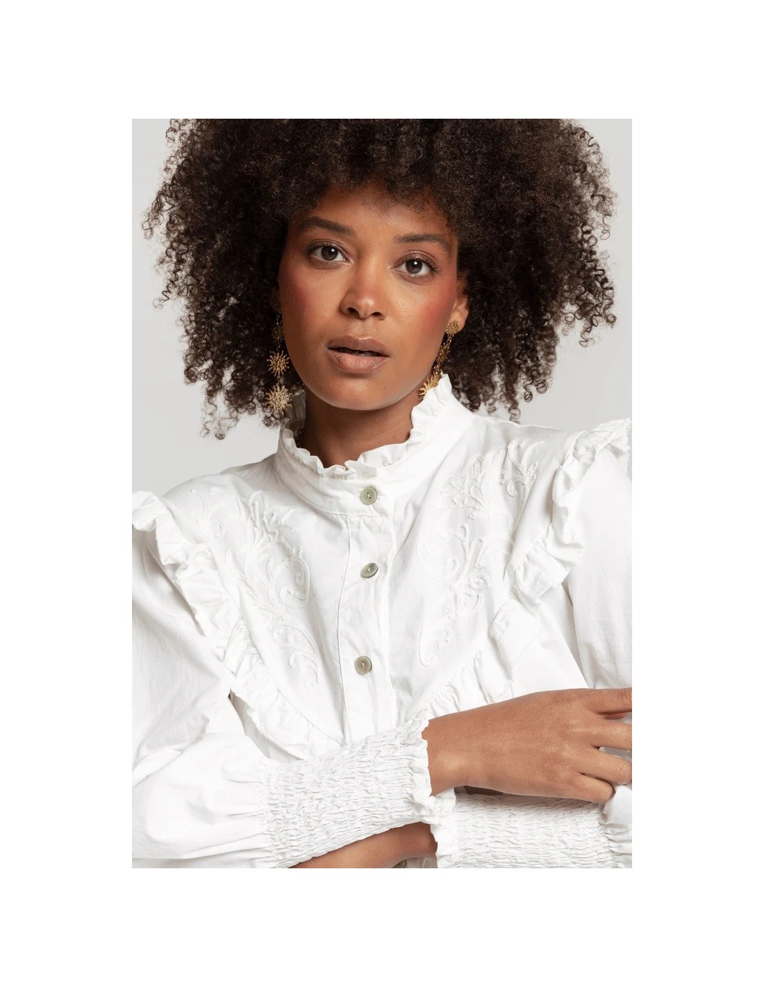 Diseño fluido y recto. Cuello redondo. Manga larga. Puño cerrado engomado. Cierre de botones. Detalles bordados.