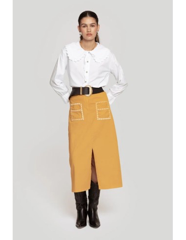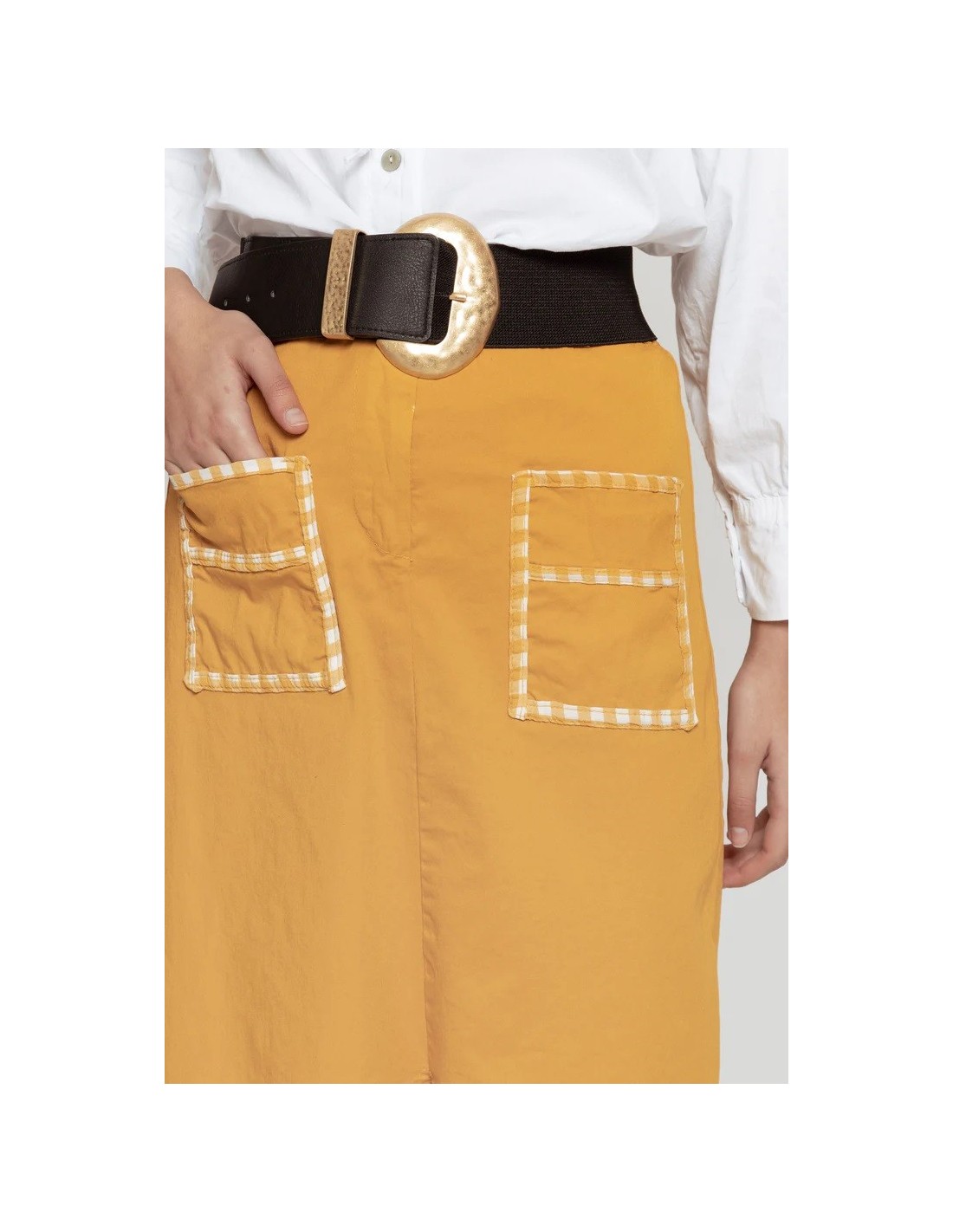 Diseño recto con Cierre de botón y cremallera. Cinturilla trasera con elástico. Trabillas. Abertura frontal. Bolsillos frontales de solapa.