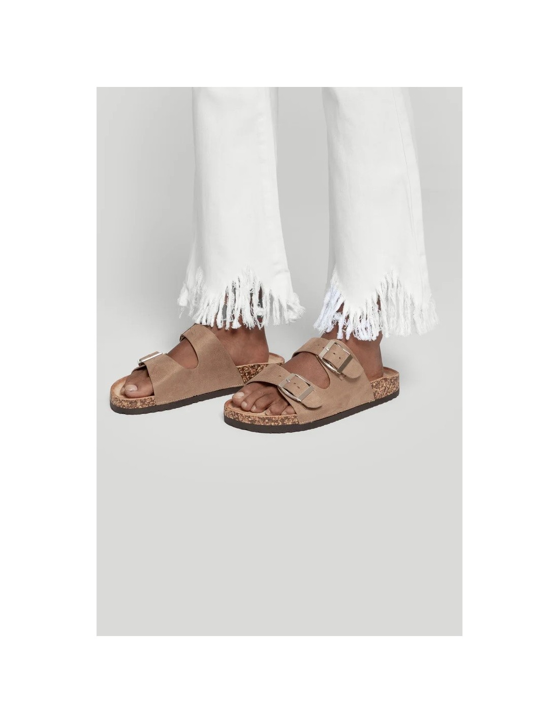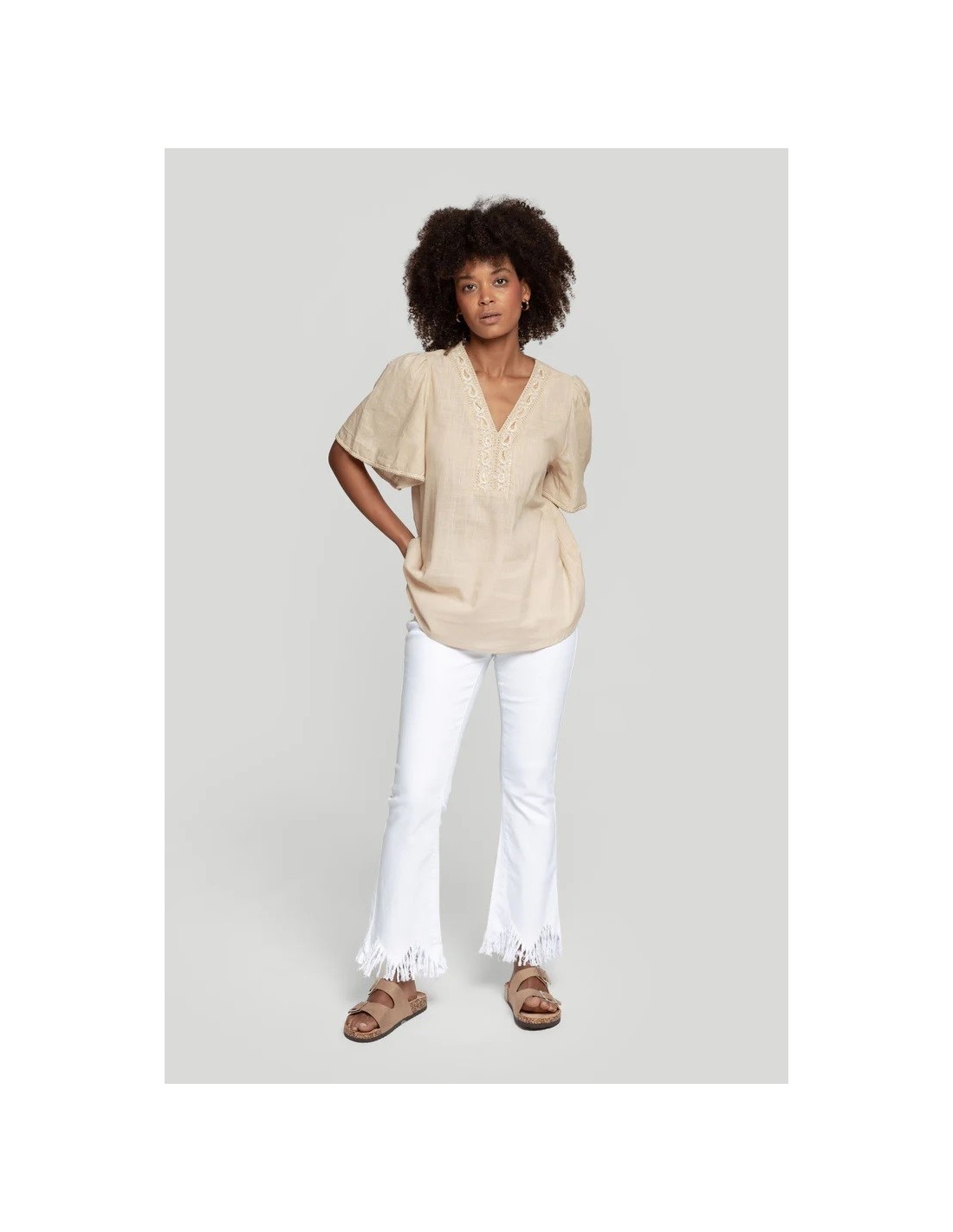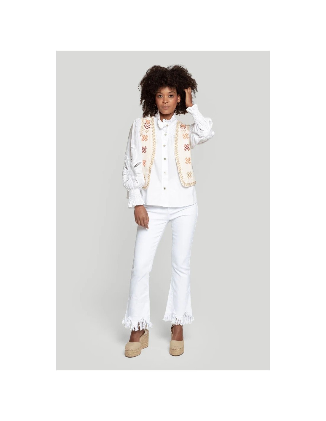 • Tiro alto. Cinco bolsillos. Cierre de cremallera y botón. Trabillas. Bajo flecos y sin rematar.